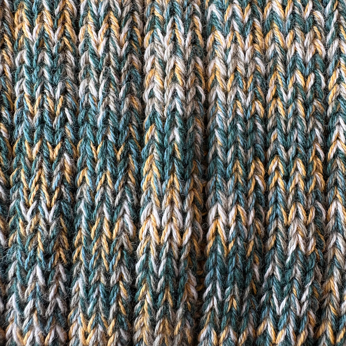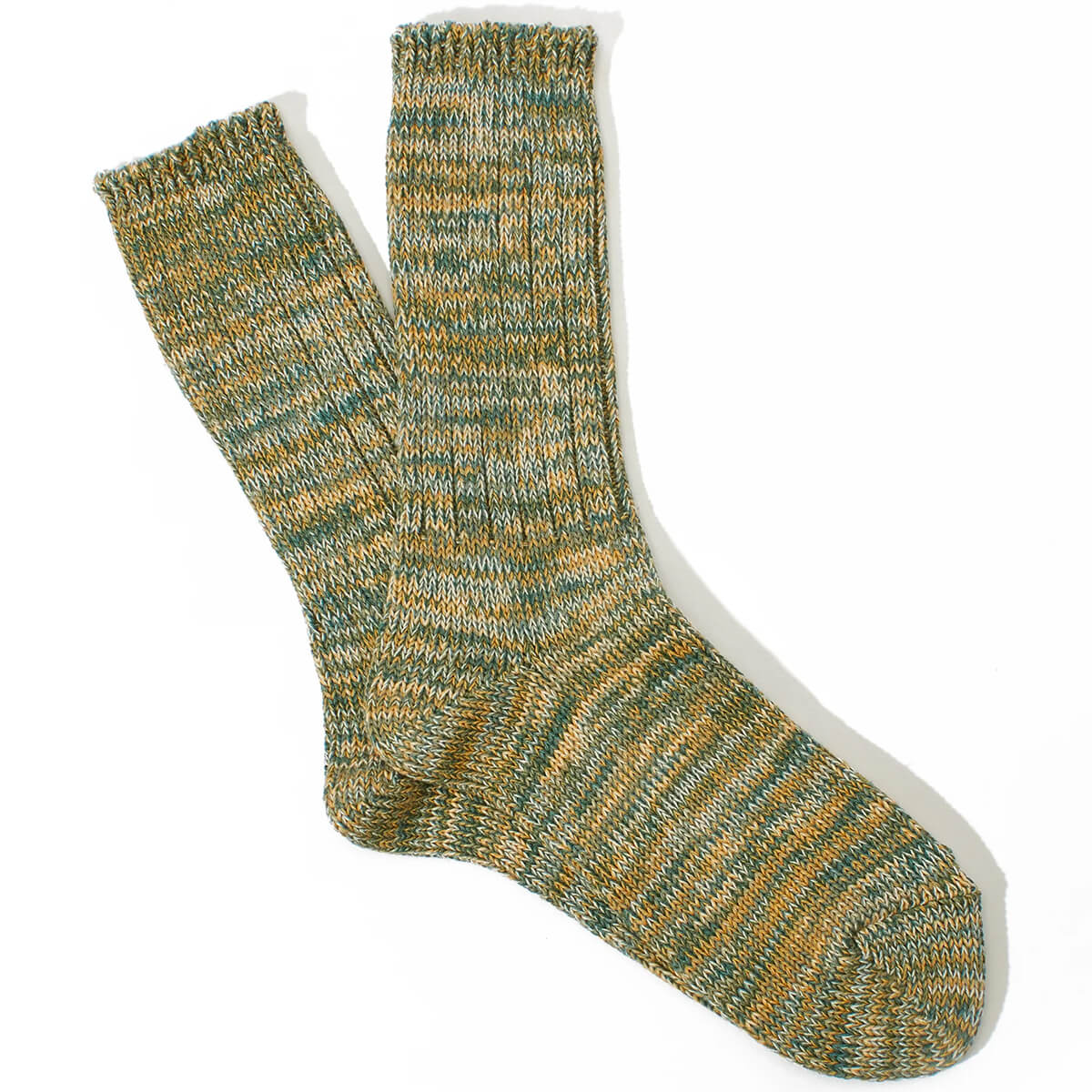 5 Colour Mix Crew Adult Socks by Anonymous Ism. The 5 colour mix crew is a medium-weight, chunky knit sock with a bouncy feel to the yarn and a supremely comfortable ribbed top. This is a signature piece from Anonymous Ism, blending craftsmanship with quality. The knitted fabric is carefully crafted using a unique over-gauge technique on low-gauge machines, achieving a perfect balance of softness, thickness, and durability. Made with vibrant, high-quality combed yarn, the socks reveal a rich, colourful pattern as the five hues intertwine beautifully, creating a distinctive and dynamic look.