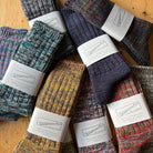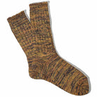5 Colour Mix Crew Adult Socks by Anonymous Ism. The 5 colour mix crew is a medium-weight, chunky knit sock with a bouncy feel to the yarn and a supremely comfortable ribbed top. This is a signature piece from Anonymous Ism, blending craftsmanship with quality. The knitted fabric is carefully crafted using a unique over-gauge technique on low-gauge machines, achieving a perfect balance of softness, thickness, and durability. Made with vibrant, high-quality combed yarn, the socks reveal a rich, colourful pattern as the five hues intertwine beautifully, creating a distinctive and dynamic look.