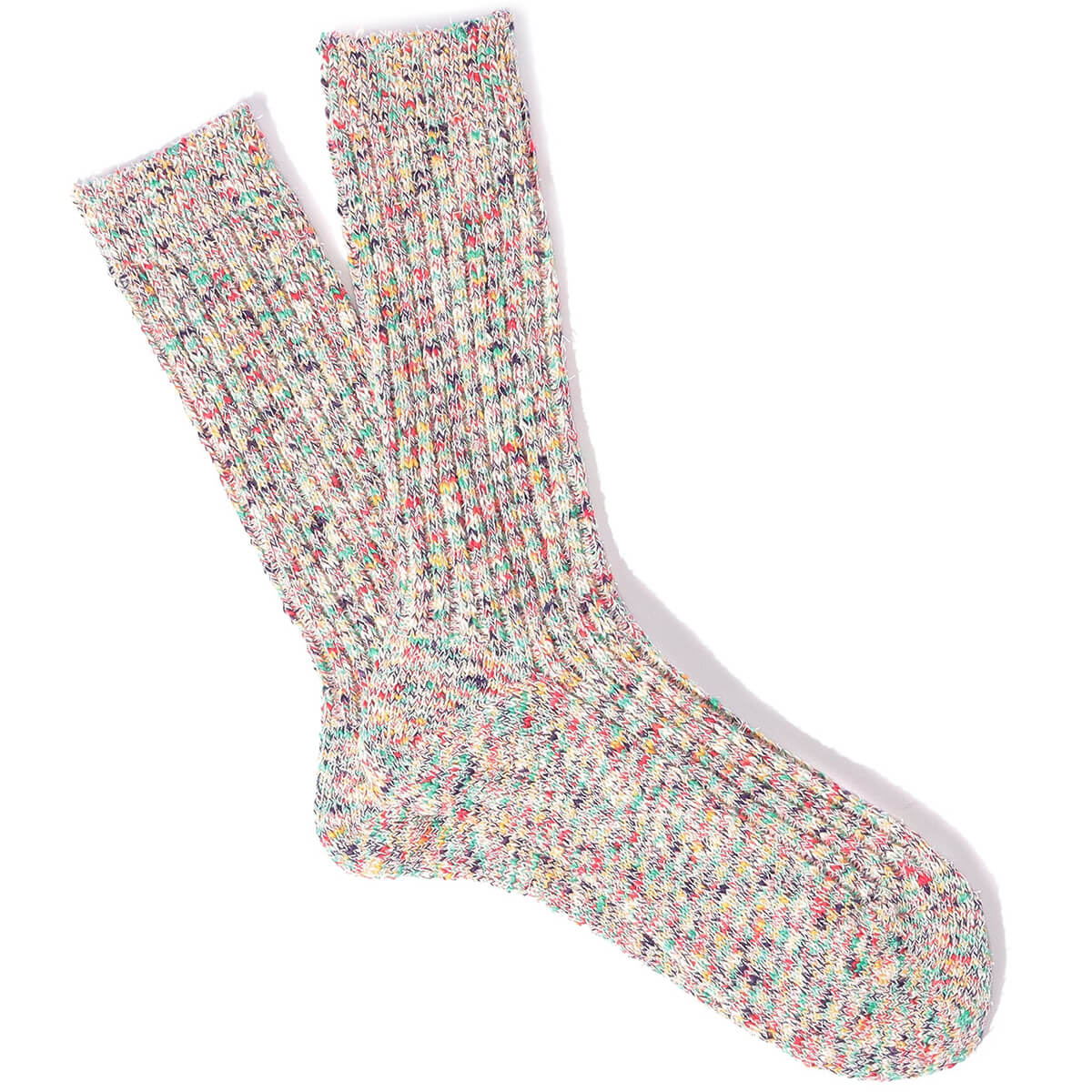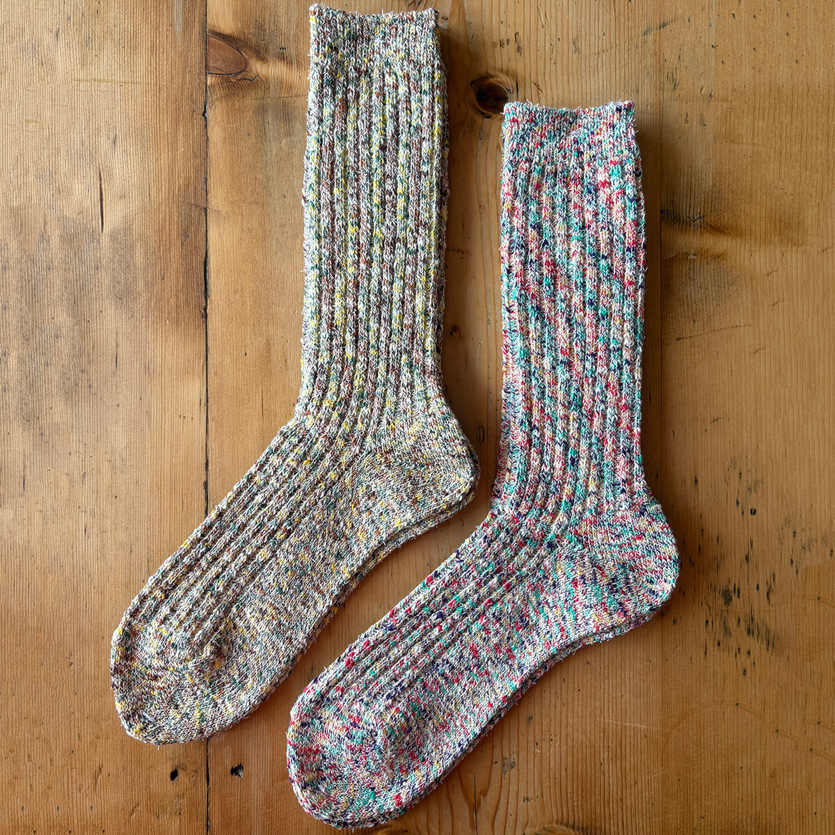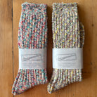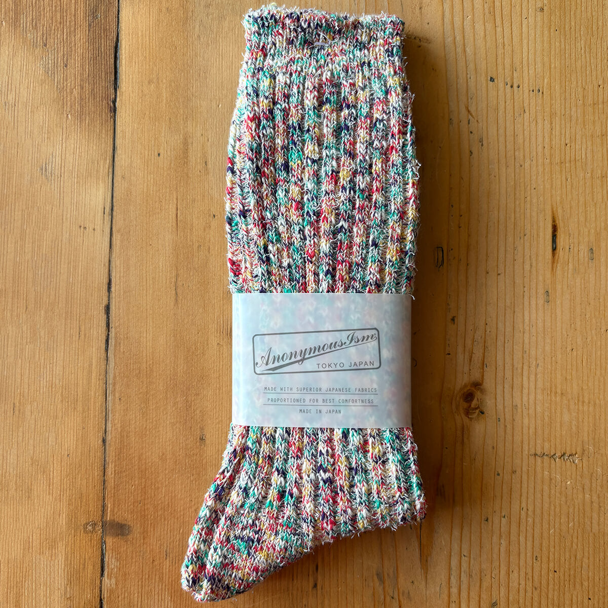 Hemp Random Stripe Pile Crew Adult Socks by Anonymous Ism. These medium weight socks feature a unique, homespun texture crafted by twisting together multiple types and colours of yarn, creating a handmade warmth and character. With a distinctive yet polished design, they seamlessly complement a variety of styles, adding a touch of individuality. The inclusion of boucle yarn lends a pleasantly dry texture, making these socks a versatile choice for year-round comfort.