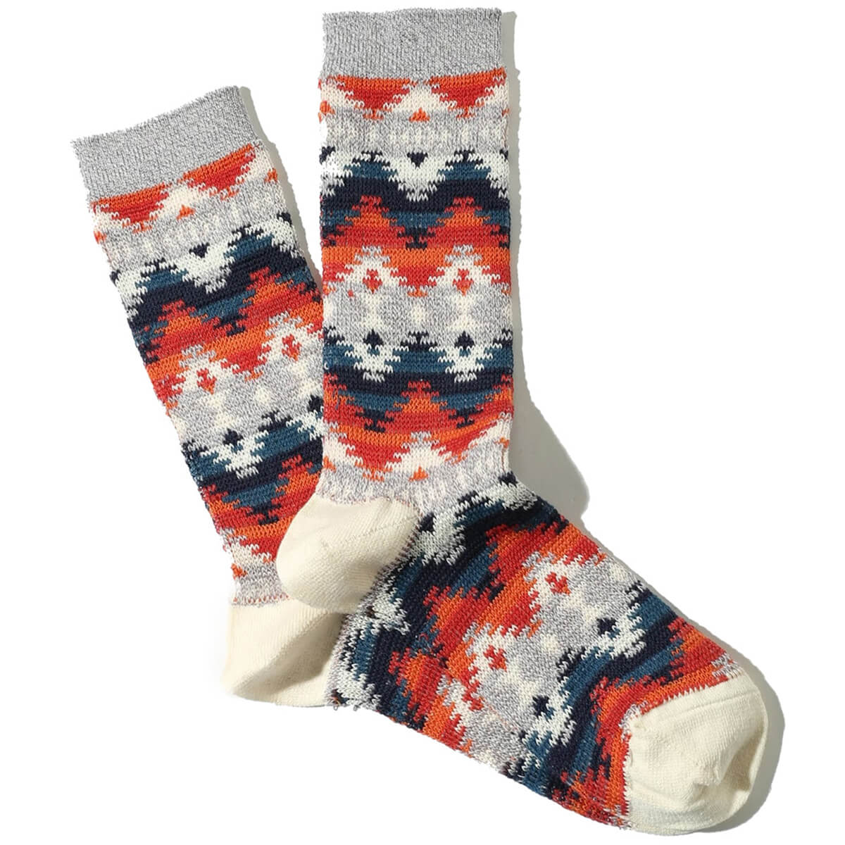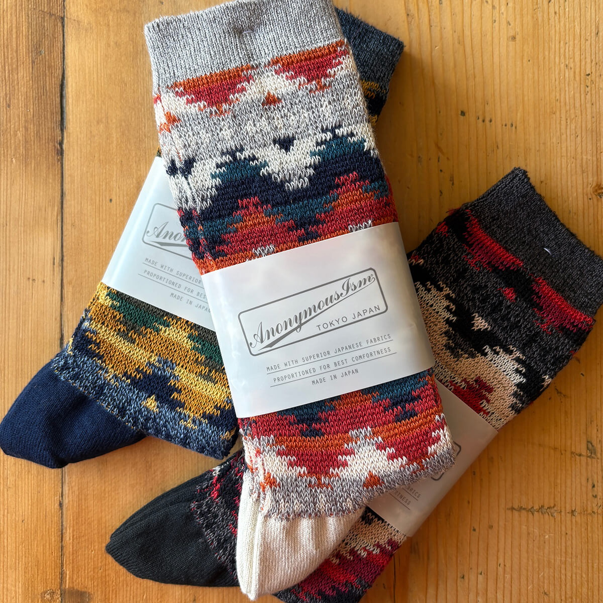 Wigwam Jacquard Crew Adult Socks by Anonymous Ism. The wigwam jacquard knitted socks feature a colourful geometric zigzag design inspired by traditional Native American patterns, with a modern and unique colour combination typical of Anonymous Ism. Made from a high-quality, comfortable cotton-blend yarn, they provide excellent support and comfort. These jacquard socks are without wool to provide a medium weight all-year round sock.
