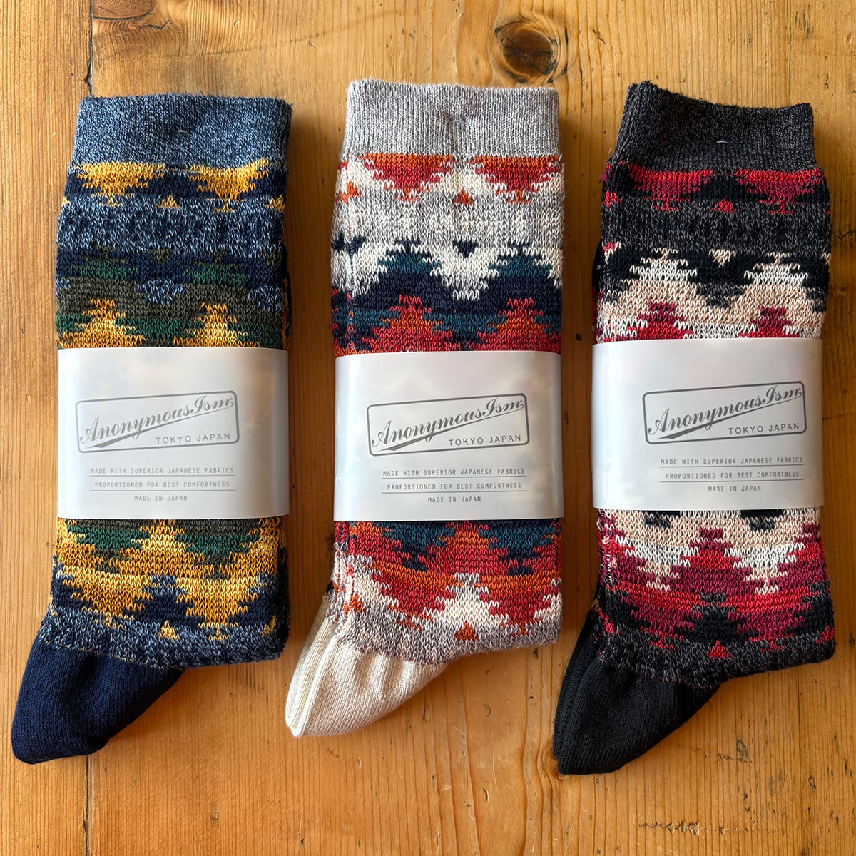 Anonymous Ism was founded in 2002 in Tokyo, Japan, making its first sock collections on 1970s traditional knitting machines which were slow and unreliable, but able to create intricate designs and textures of exceptional quality which was not possible in commercial manufacturing. The machines were rare, with spare parts very hard to find, so Anomymous Ism developed modern alternatives in sock production that could replicate the feel of the old looms and reproduce the traditional Japanese textile techniques without having to worry about machinery parts falling off. The brand continues to manufacture in Japan using sustainable techniques and thoughtful packaging. Its rider (the wrap around the socks) was developed with the Japanese government, it’s made from Limex (limestone) and will one day go back to being limestone. Anonymous Ism designs reference not only traditional sock-making but also diverse modern sources - marine, military and workwear, to name a few. Historical Japanese designs, incorporating art, traditional clothing and the ancient military disciplines also contribute to a huge variety of influences and inspirations. The brand has become synonymous with understated anonymous style and timeless design, and many of their designs have now become iconic, modern classics.