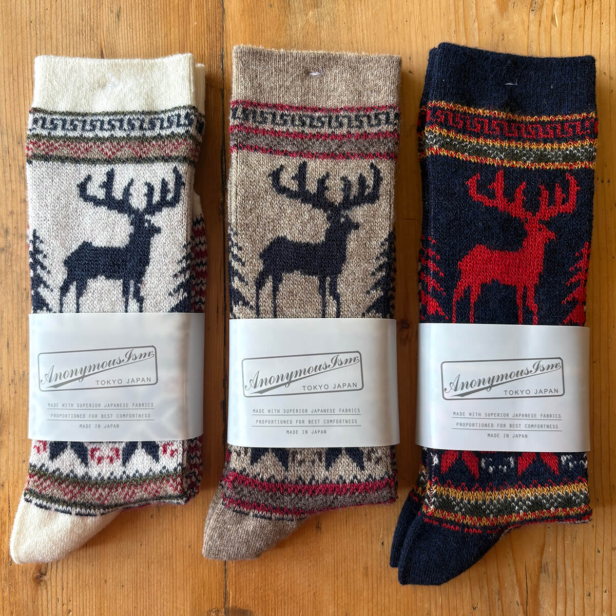 Wool Deer Snow Jacquard Crew Adult Socks by Anonymous Ism. A winter essential, these jacquard knit socks provide excellent stretch and comfort. Made with a high wool content to offer warmth without added thickness.