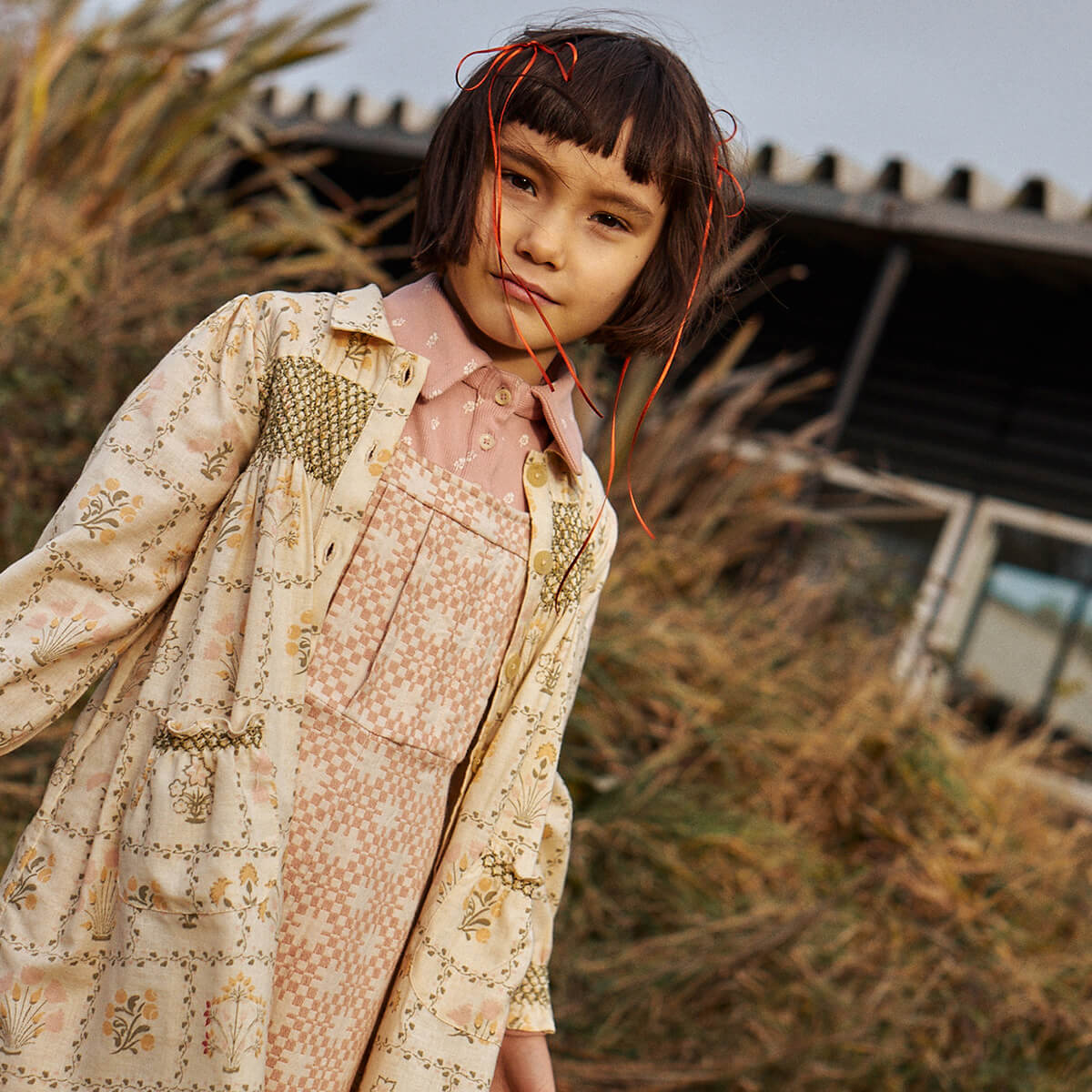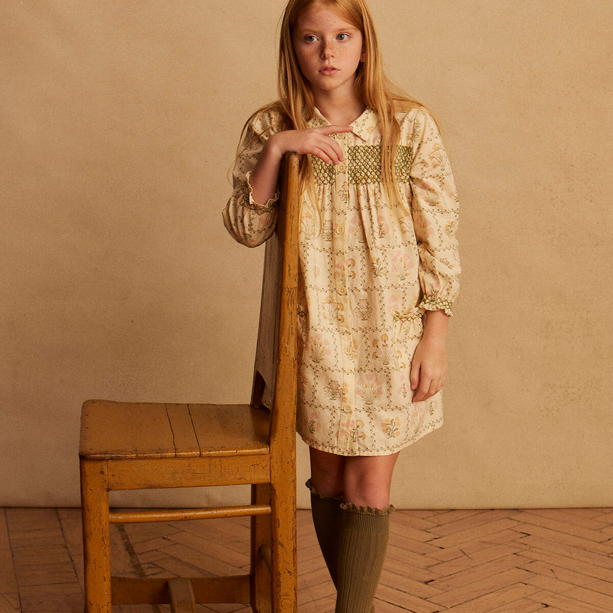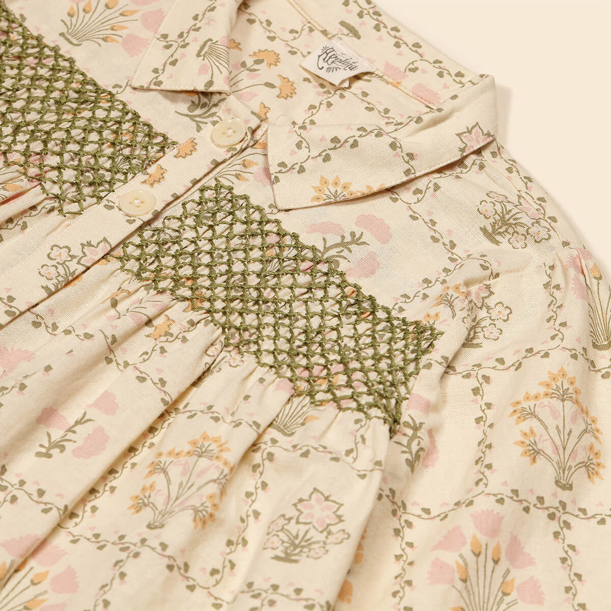 Aline Smock Shirtdress by Apolina. The beautiful vintage-inspired Aline shirtdress is crafted in cabin quilt floral print in cream. Featuring hand smocking in ‘sage green’ at chest, cuffs and pockets. Button through shirt style. Aline evokes classic story book style, we love her worn as a dress with tights, or worn unbuttoned over dungarees or jersey layers.