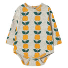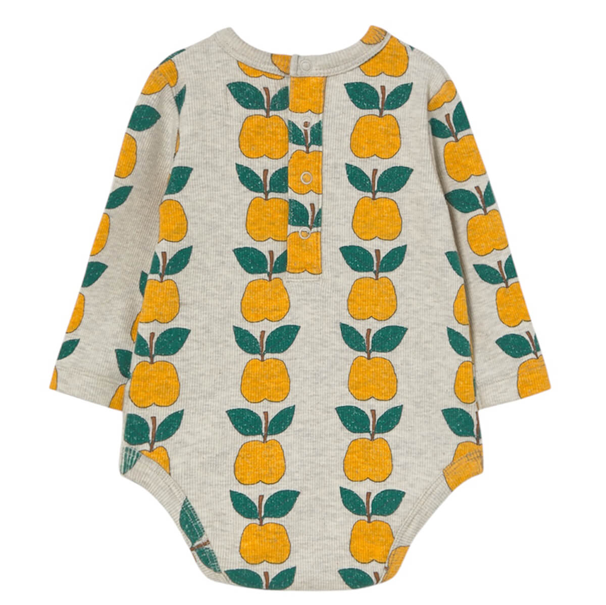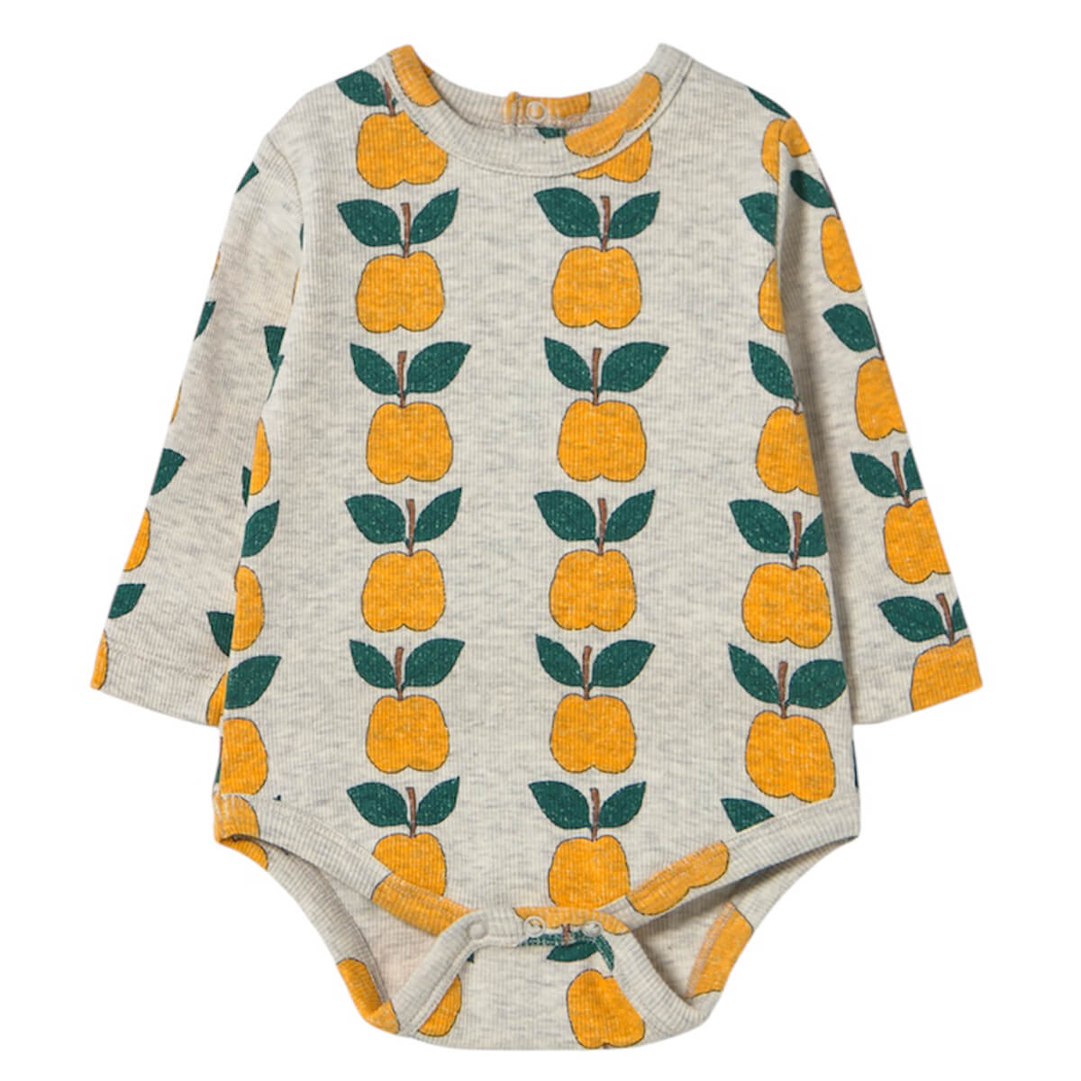 Apples Rib Body by Tinycottons. This colourful Apples printed rib bodysuit is crafted from a soft cotton blend, offering a breathable feel. It features a comfortable, relaxed silhouette with long sleeves and a snap opening at the bottom.