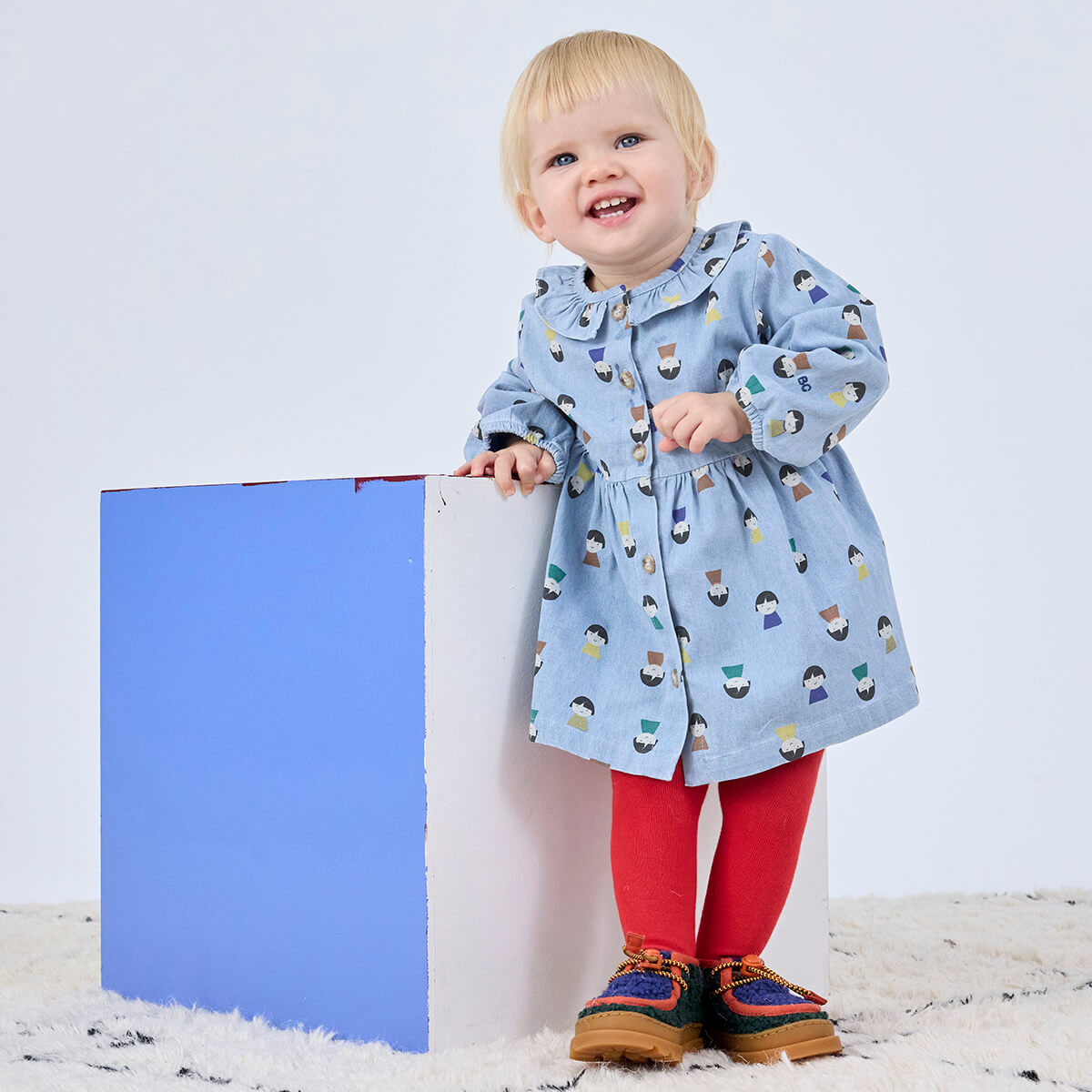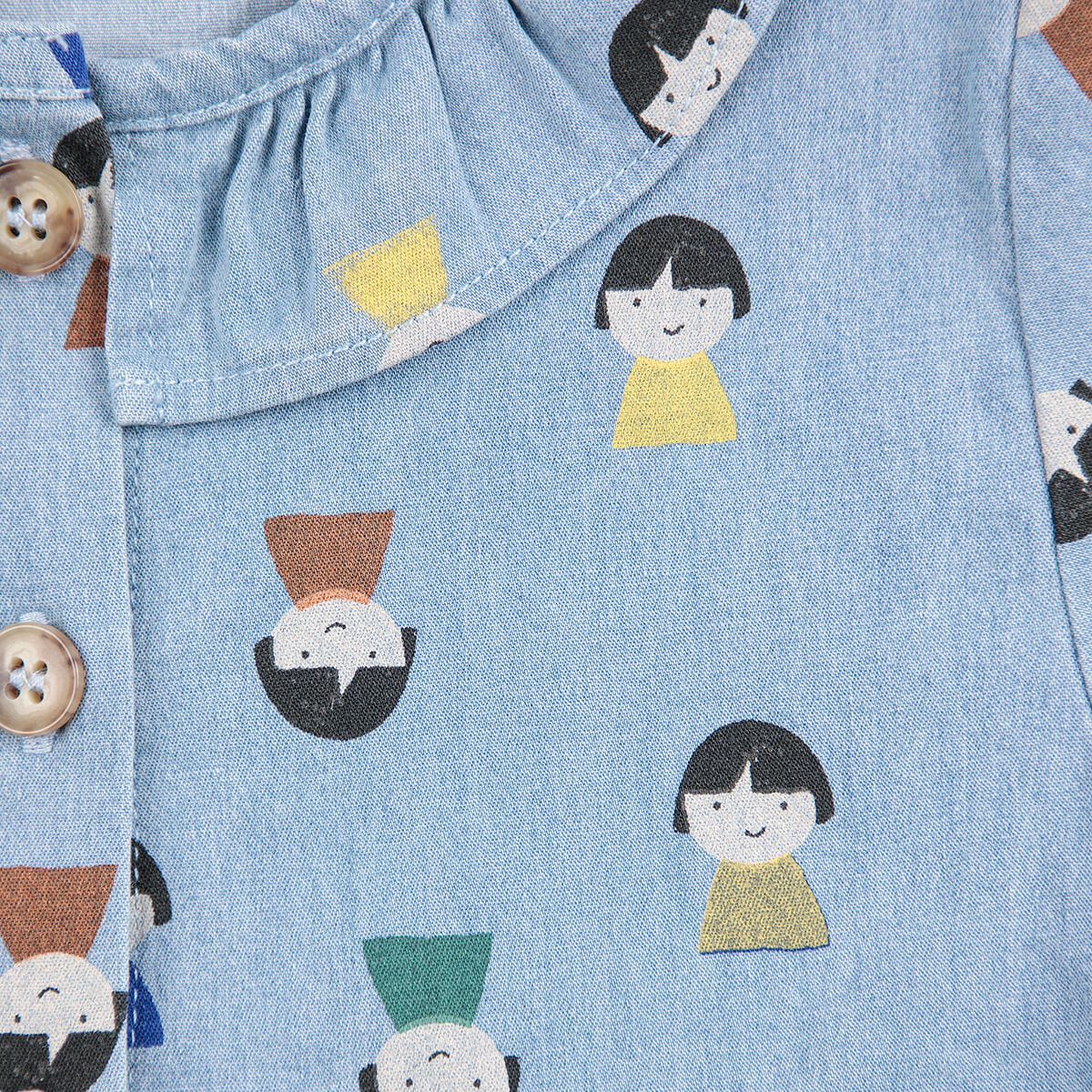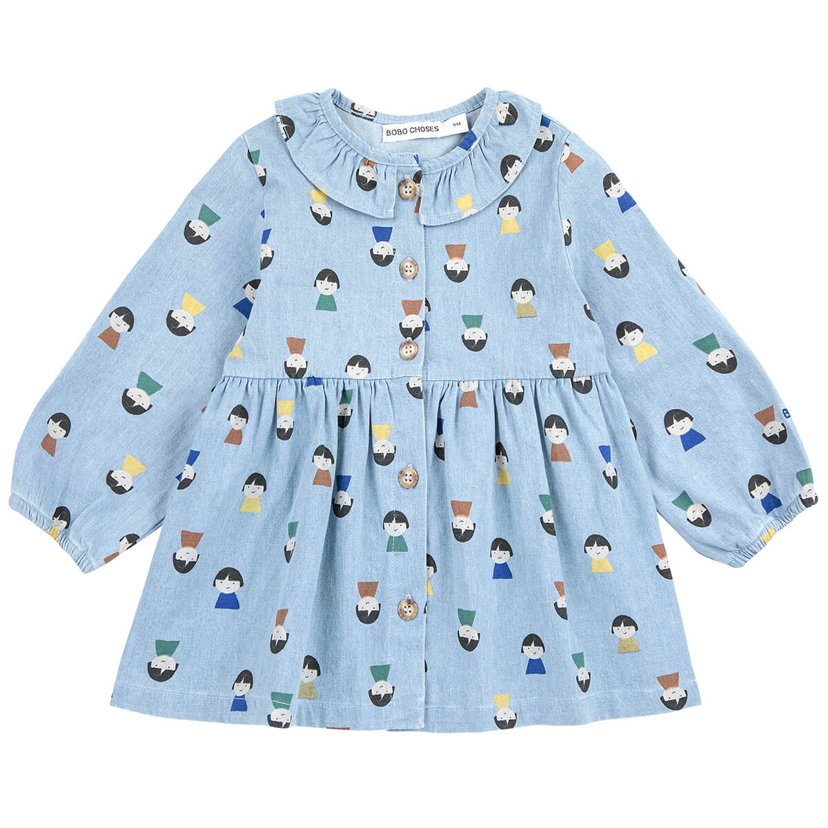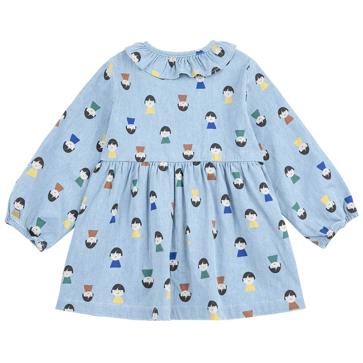 Game Pawns All Over Denim Baby Pants by Bobo Choses. This playful dress combines comfort and charm. Designed with long sleeves, dropped shoulders, front button fastening, elasticated cuffs, and ruffled detailing.