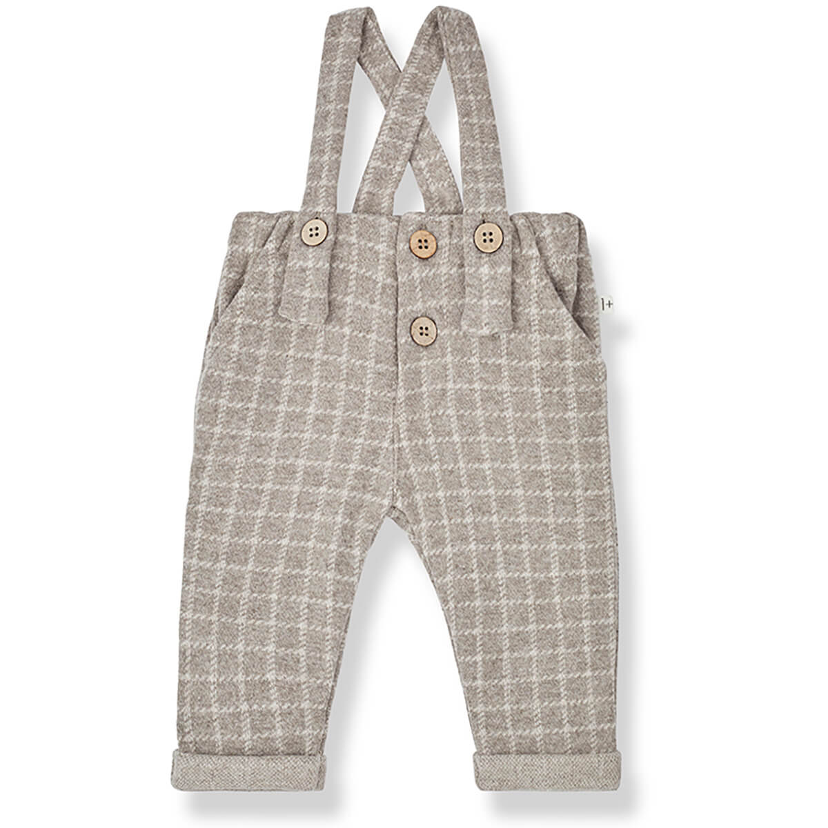Hendrick overall with feet by 1+ in the Family. Baby dungarees with elasticated waist, pockets and roll up cuffs. With wooden buttons.