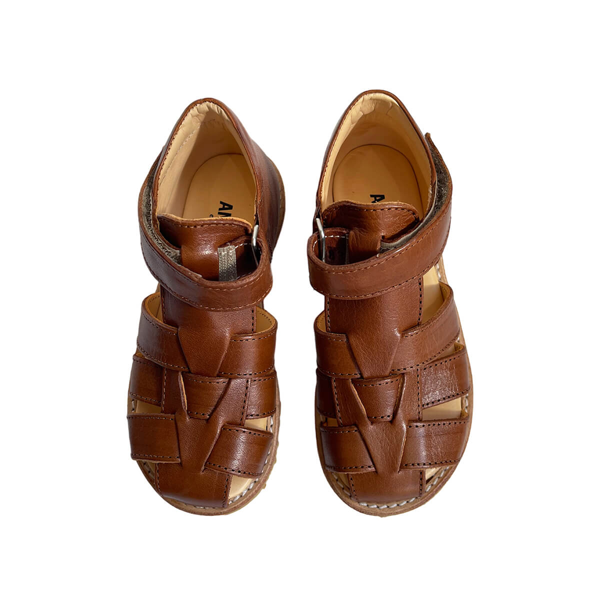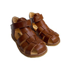 Fisherman starter sandals by Angulus. Classic fisherman style sandal with adjustable velcro strap. Closed toe and solid heel cap for maximum support. Soft and flexible crepe rubber sole. Lined with 100% chrome-free leather.