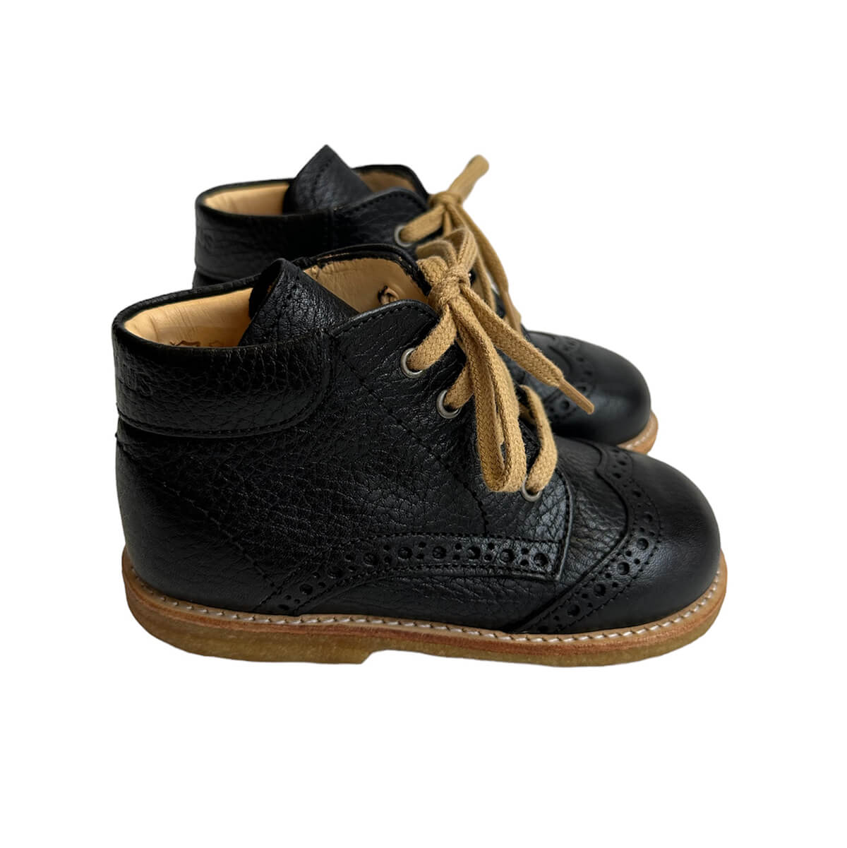 Lace up starter boots by Angulus. Leather lace up boots with brogue detail, ideal as first walkers as they provide very good ankle support, with a soft and flexible crepe rubber sole. Lined with 100% chrome-free leather.