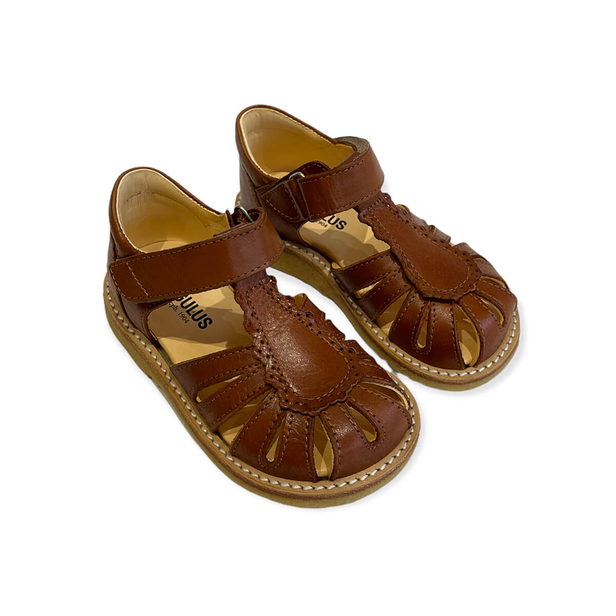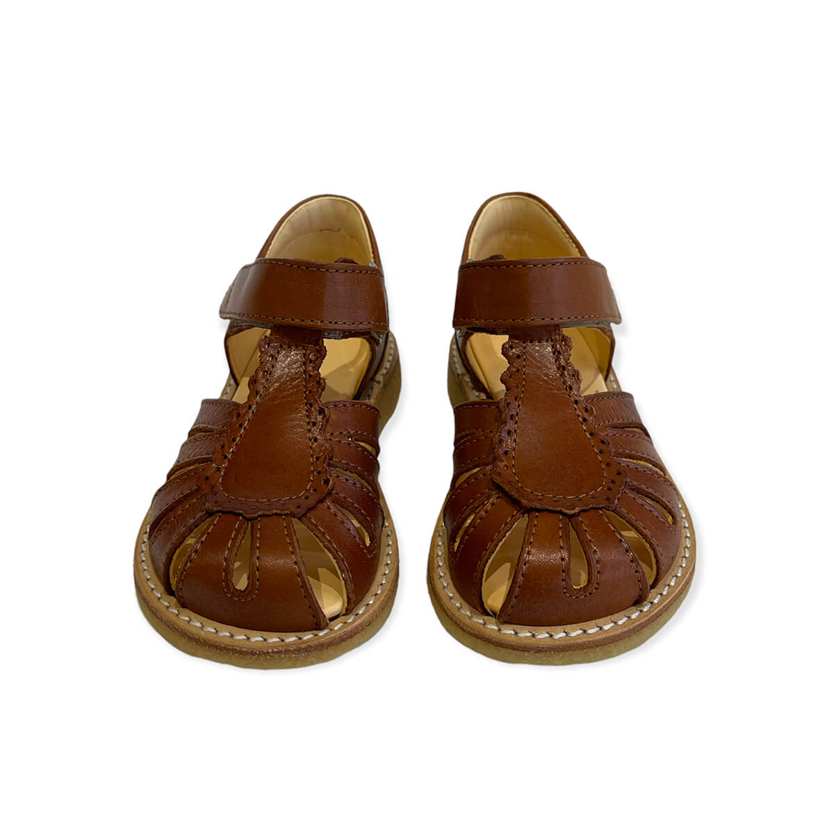Leather starter sandals with scallop detail on the front by Angulus. T bar sandals with scallop detail and adjustable velcro strap. Closed toe and solid heel cap for maximum support. Soft and flexible crepe rubber sole. Lined with 100% chrome-free leather.