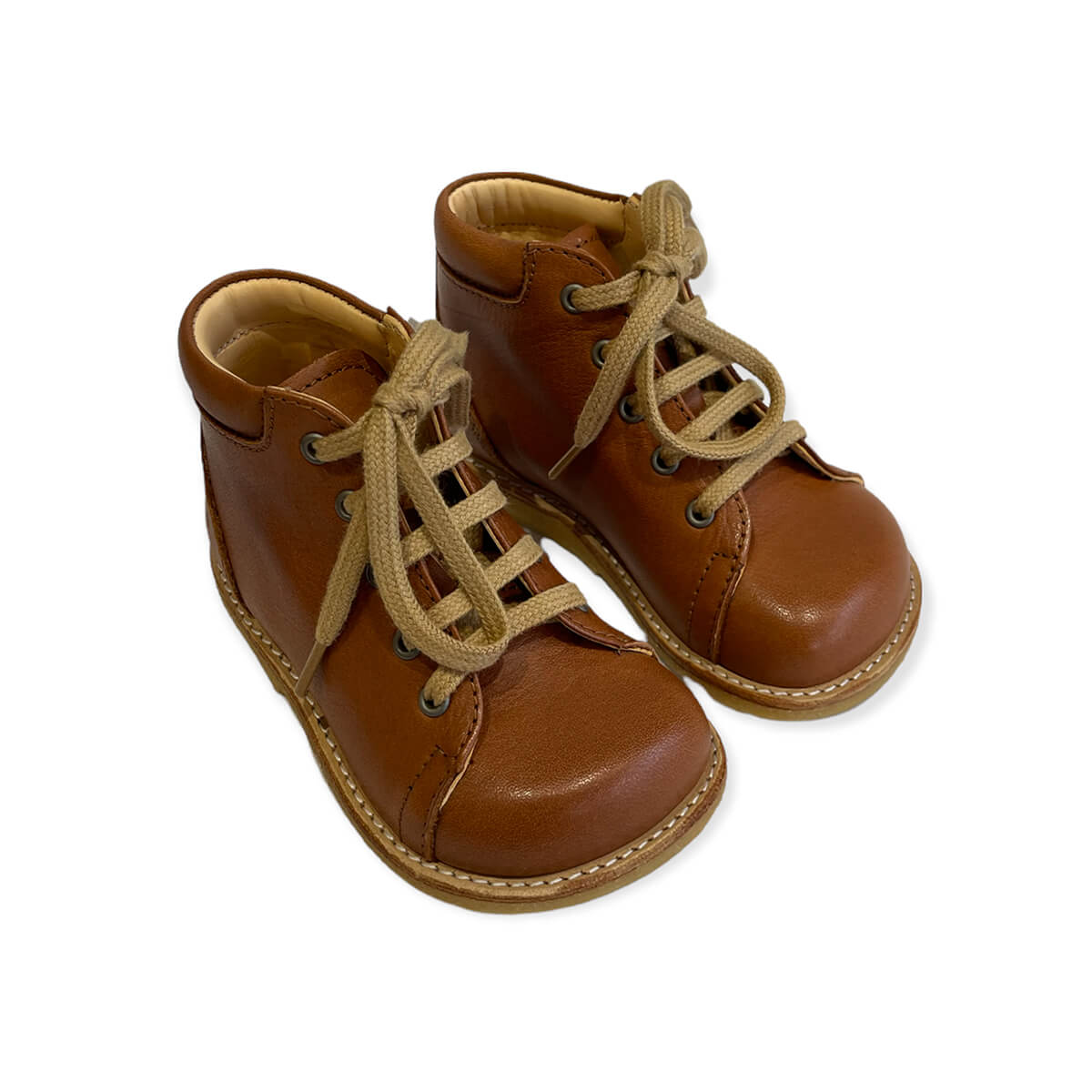 Lace up starter boots in a wider fitting by Angulus. Leather lace up boots with stitching detail, ideal as first walkers as they provide very good ankle support, with a soft and flexible crepe rubber sole. Vegetable tanned leather.