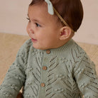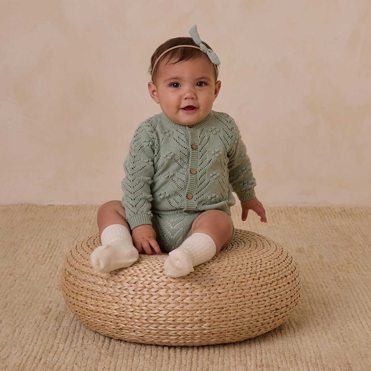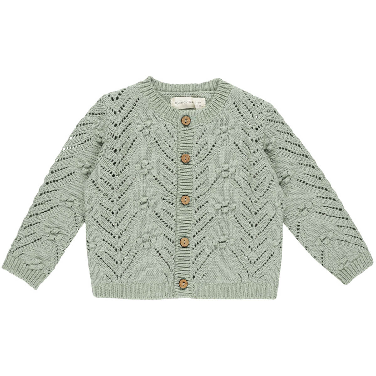 Knit Cardigan by Quincy Mae. A pointelle knit cardigan with scallop trims and coconut buttons.