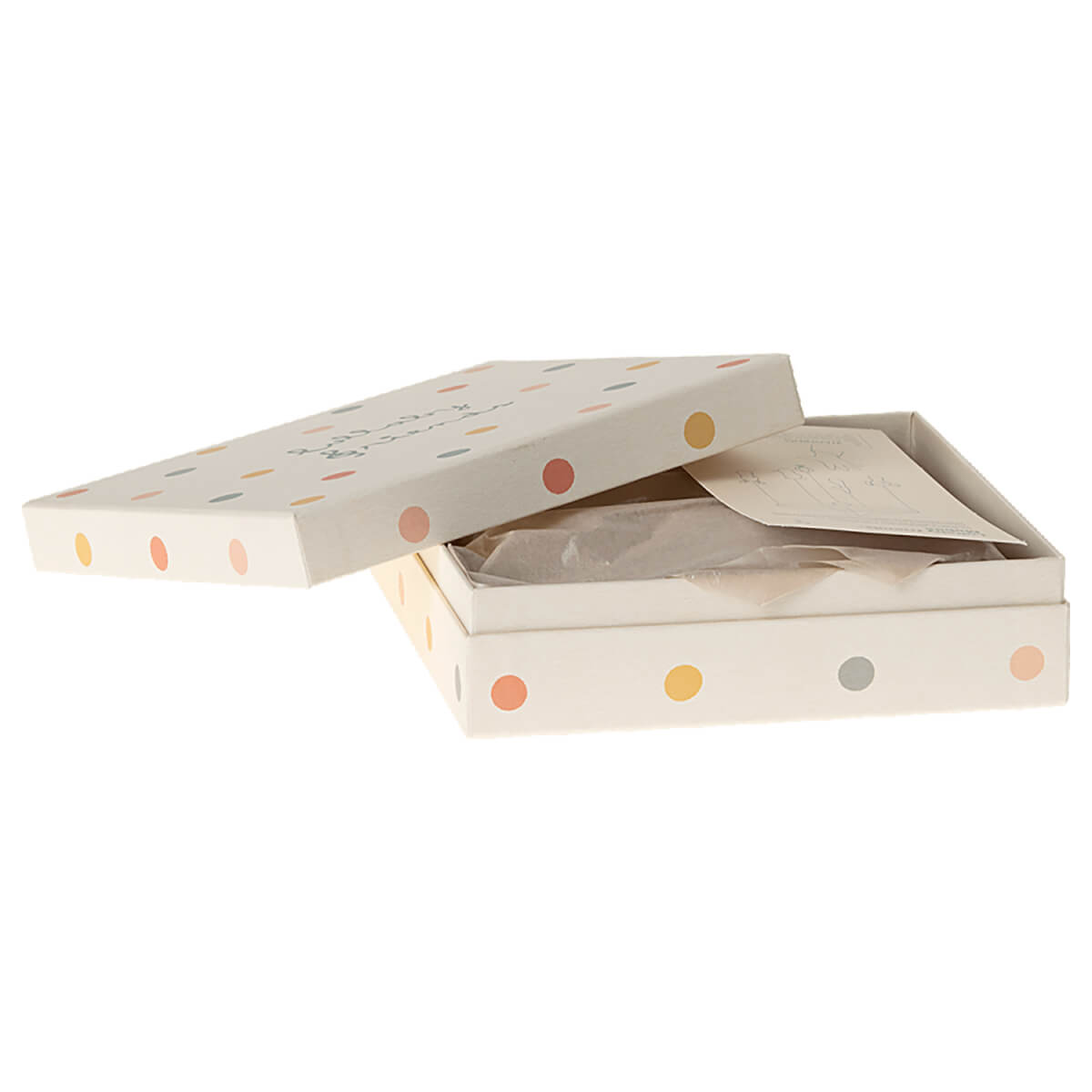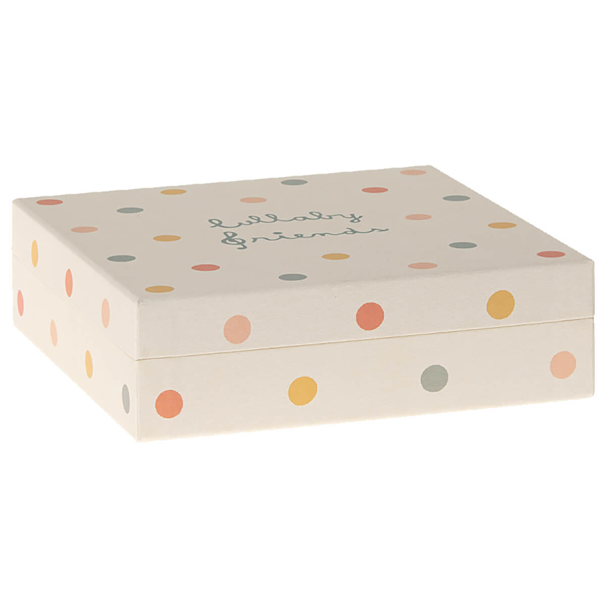 Lullaby Friends mobile by Maileg. Lullaby friends is a collection with beautiful baby items. This mobile is perfect for the baby to look at from the bed or from the nursery table. The animals are made in soft fabrics with unique prints and are packed in a beautiful gift box.