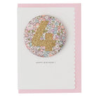 Age 4 Badge Greetings Card in Michelle Liberty Print by The Charming Press. Fourth birthday card featuring a beautiful glittery Liberty birthday badge. Made in Liberty tana cotton lawn with a biodegradable glitter number, pressed onto a metal badge. The badge is pinned onto a beautiful scallop edged white card, blank inside for your own message. Pink envelope.