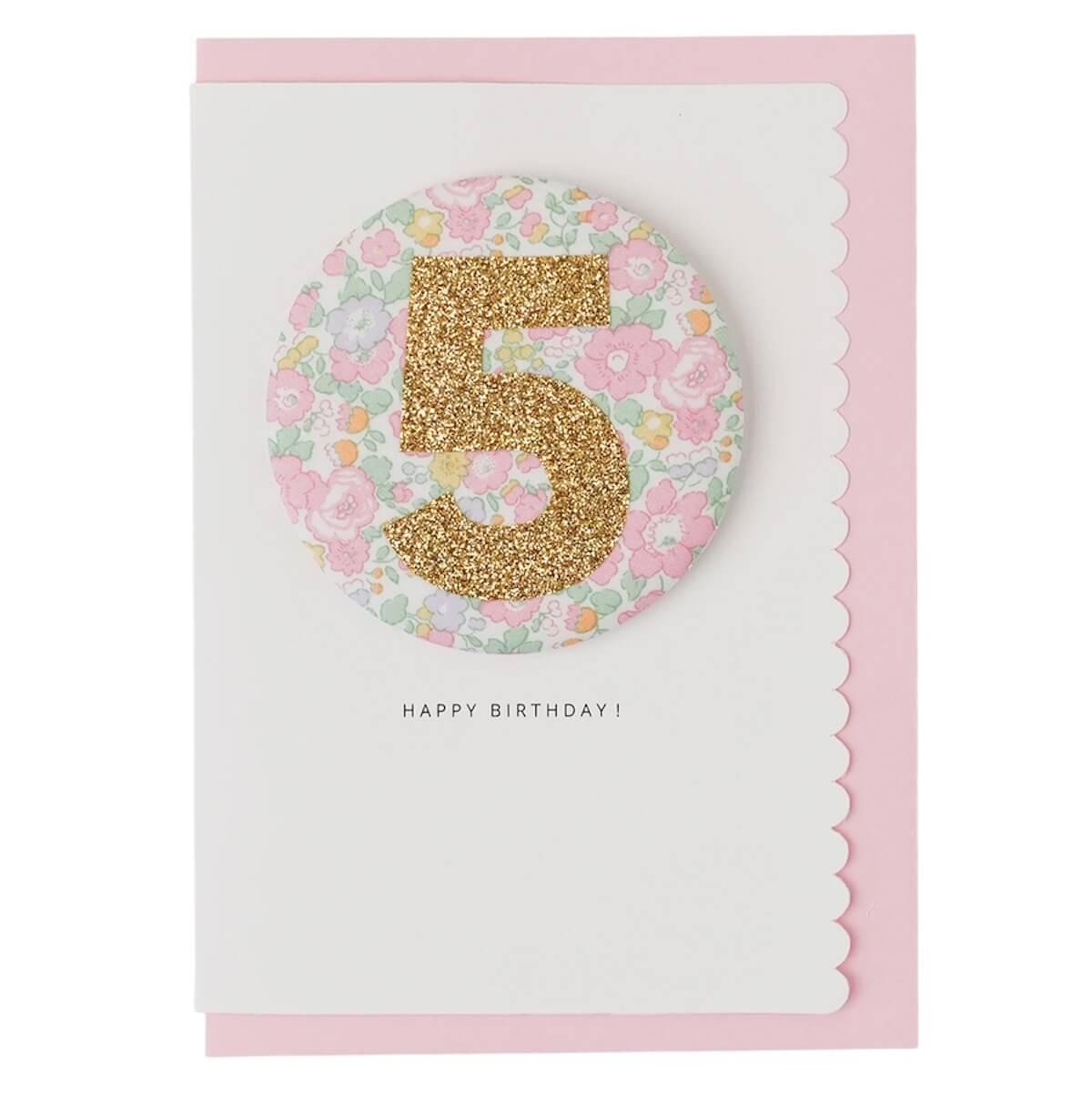 Age 5 Badge Greetings Card in Betsy Ann Liberty Print by The Charming Press. Fifth birthday card featuring a beautiful glittery Liberty birthday badge. Made in Liberty tana cotton lawn with a biodegradable glitter number, pressed onto a metal badge. The badge is pinned onto a beautiful scallop edged white card, blank inside for your own message. Pink envelope.