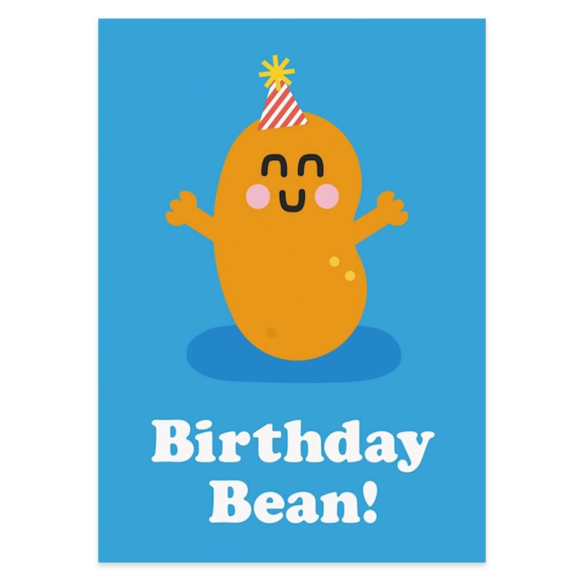 Birthday Bean Birthday greetings card by Studio Boketto. This colourful birthday greeting card is one for the beans! Featuring a large illustrated bean with a big grin and a party hat above the caption "Birthday Bean", this heartfelt design makes a unique first birthday card for a new little bean, as well as for any loved one who's a cute bean. Add a handwritten message on the inside to make it personal!