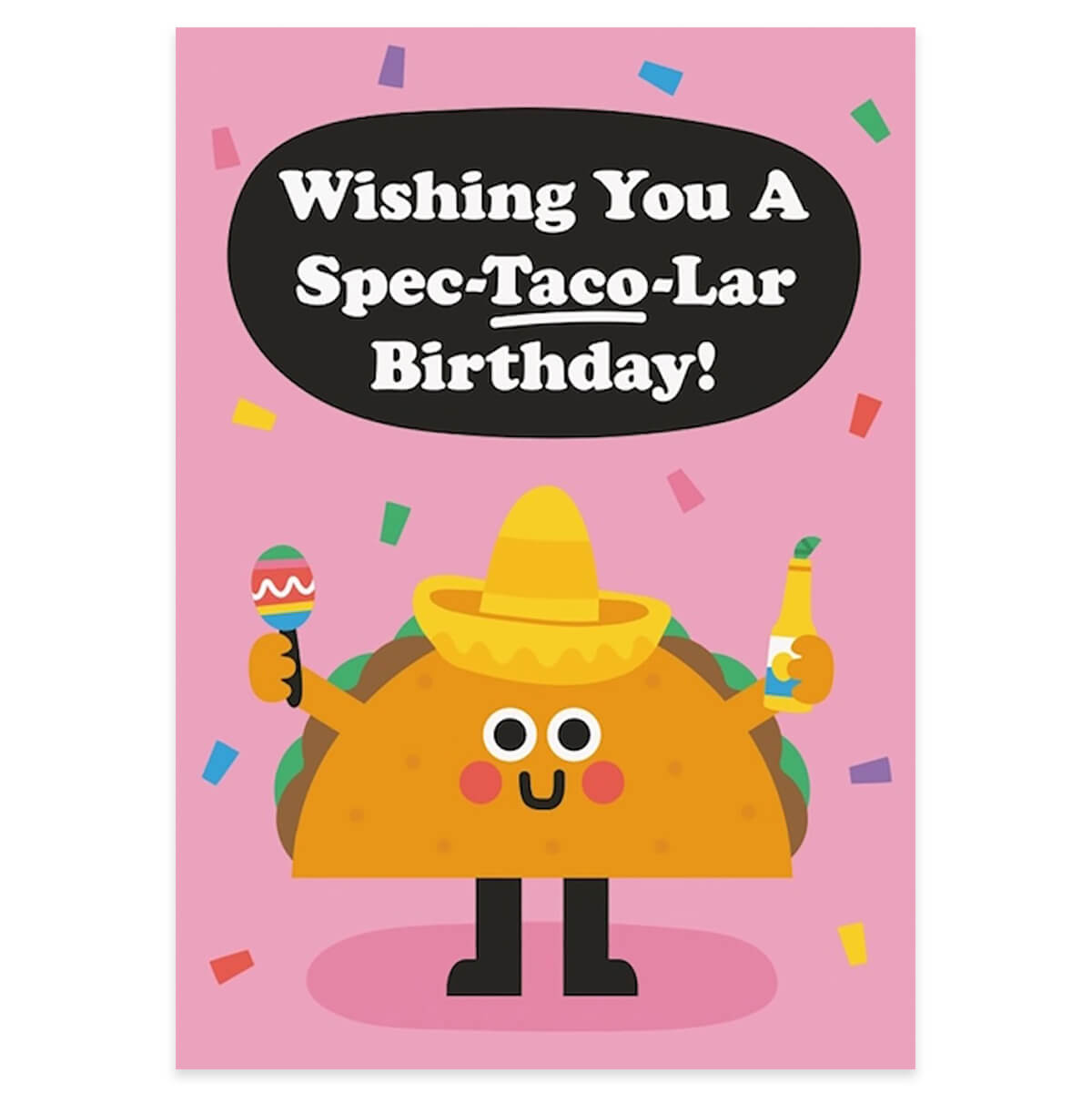 Spec-Taco-Lar Birthday greetings card by Studio Boketto. It's time for a fiesta! A jovial taco wearing a sombrero shakes a maraca and holds a beer aloft, their delicious taco body smiling under the birthday card caption, which reads "Wishing You A Spec-Taco-Lar Birthday!" This funny birthday card is perfect for a fan of puns, mexican food, and parties - add a handwritten message to the blank inside to make it personal.