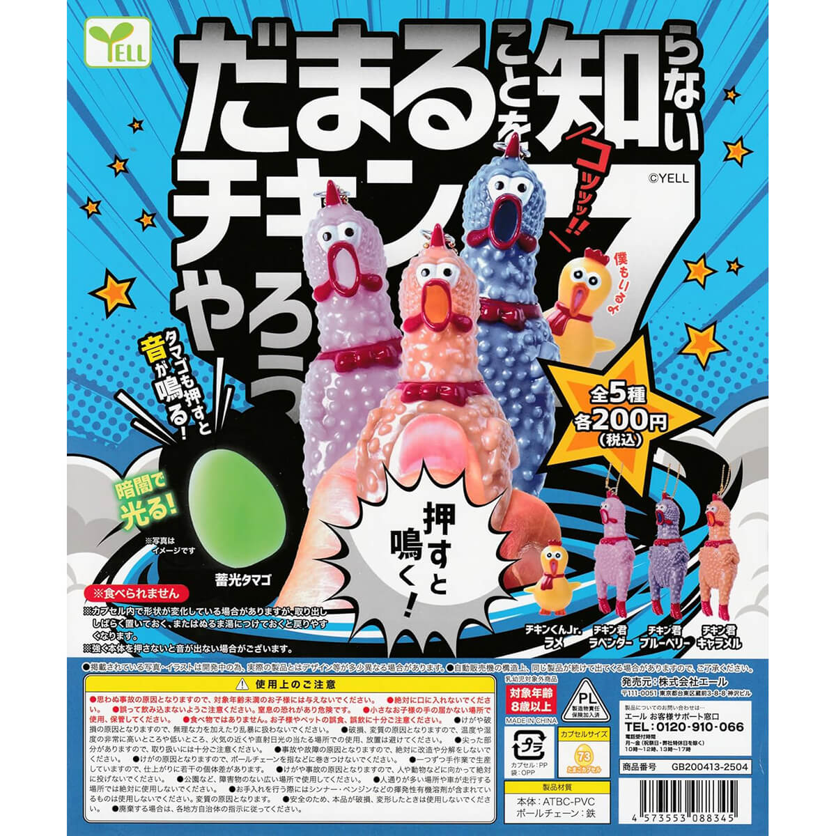 There are four different noisy chickens, plus one glow in the dark squeaky egg, in this Gachapon series: Glitter Yellow Chicken Jr., Lavender Chicken, Blueberry Chicken, Caramel Chicken and a glow in the dark egg. Please note one gachapon is the egg only!