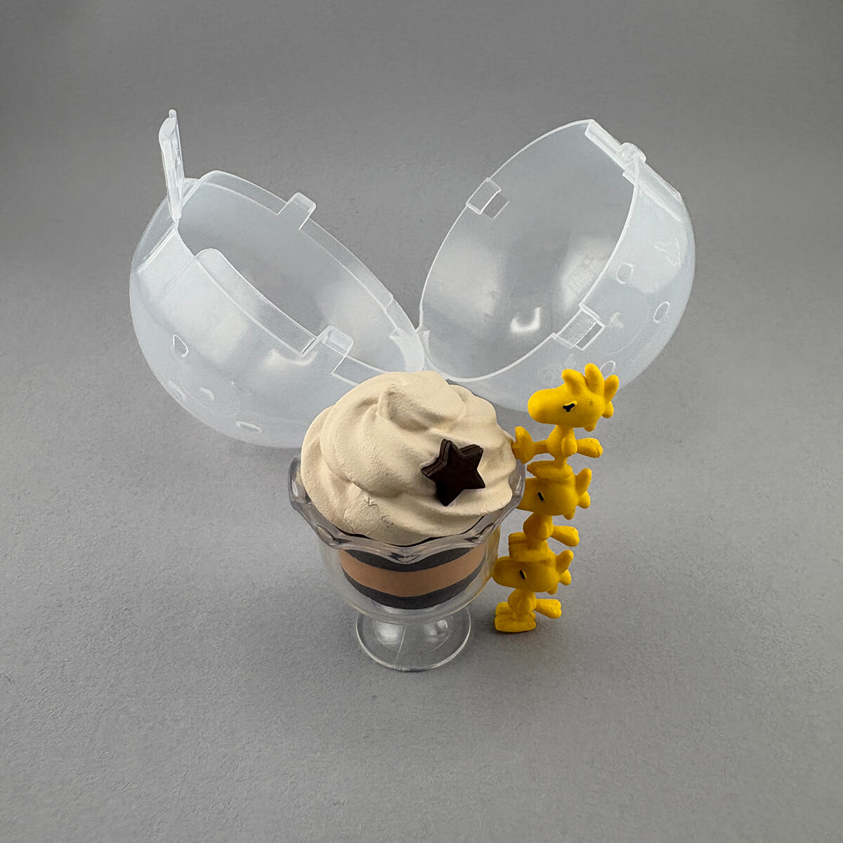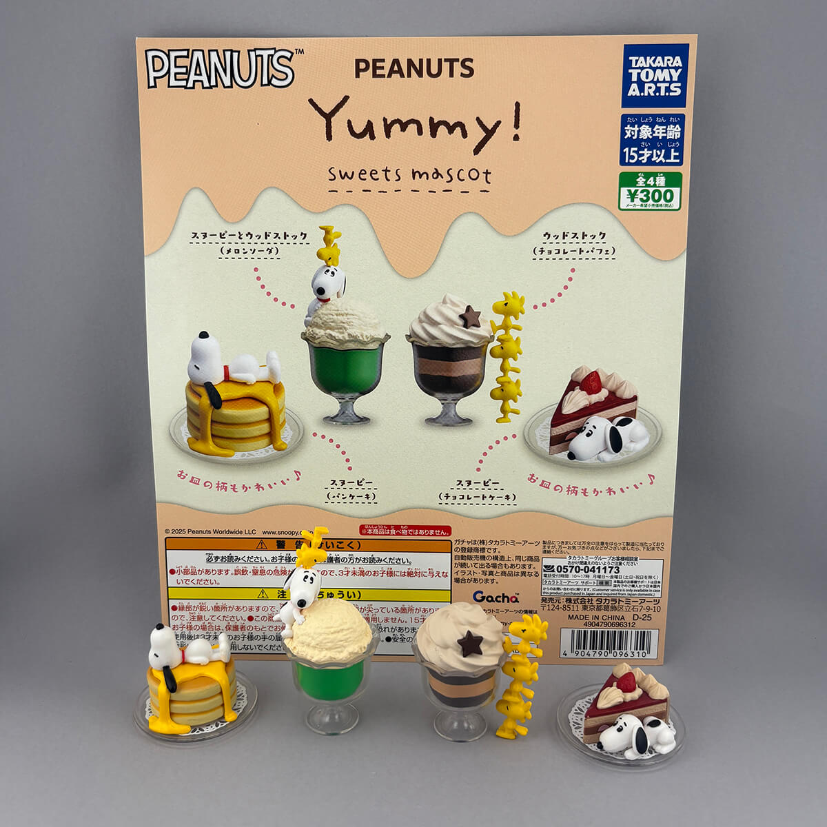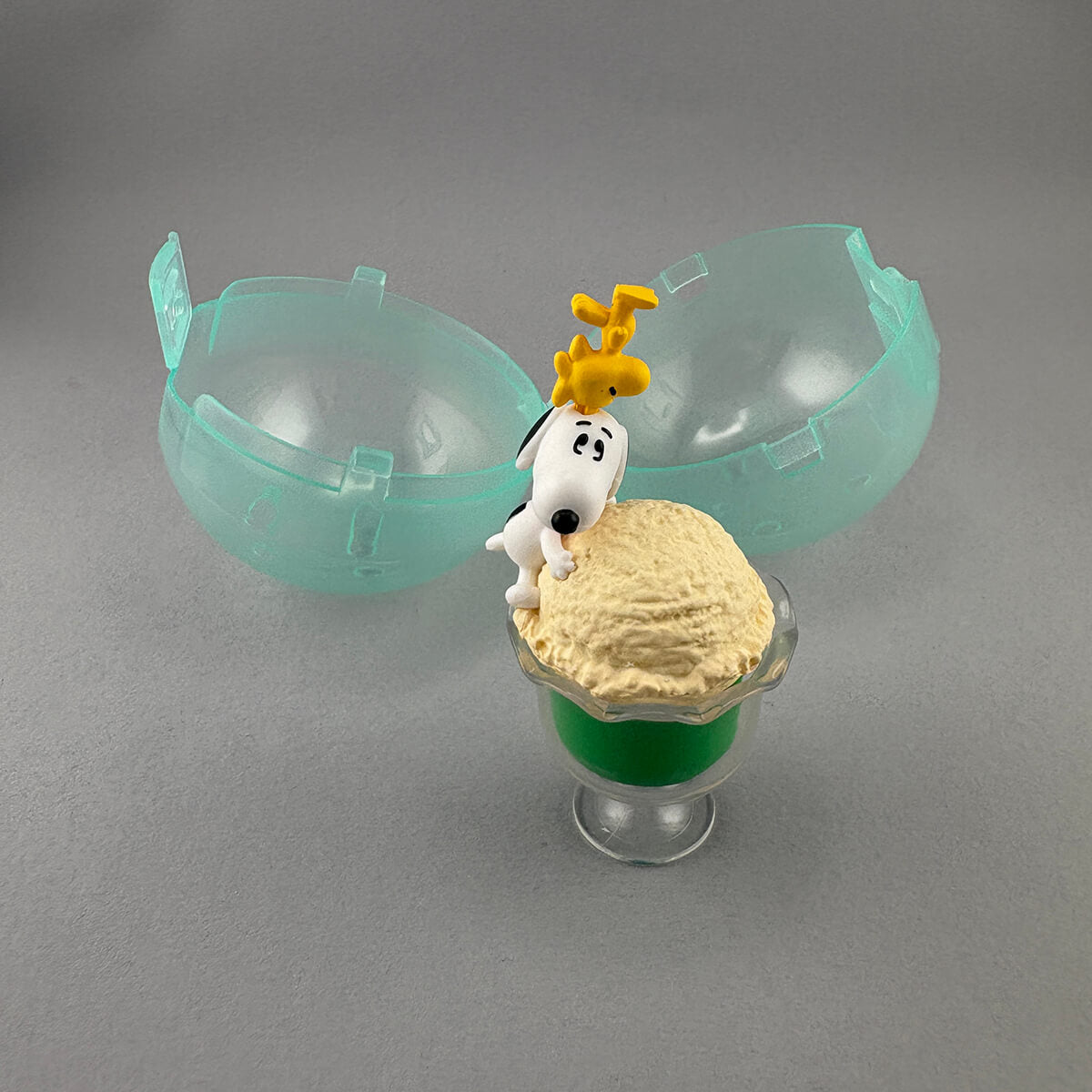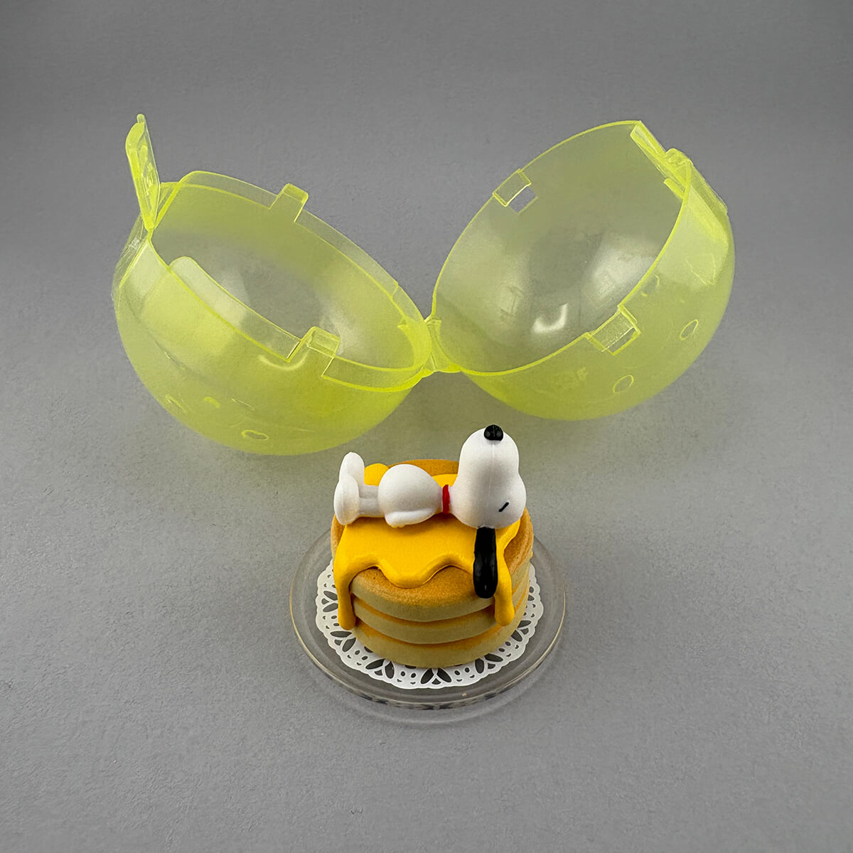 Peanuts Yummy Sweets Mascot Gachapon Capsule Collectible by Takara Tomy. Highly collectible and authentic Japanese gachapon capsule containing one of four different desserts with Snoopy and Woodstock - pancakes, melon soda, chocolate parfait and chocolate cake.