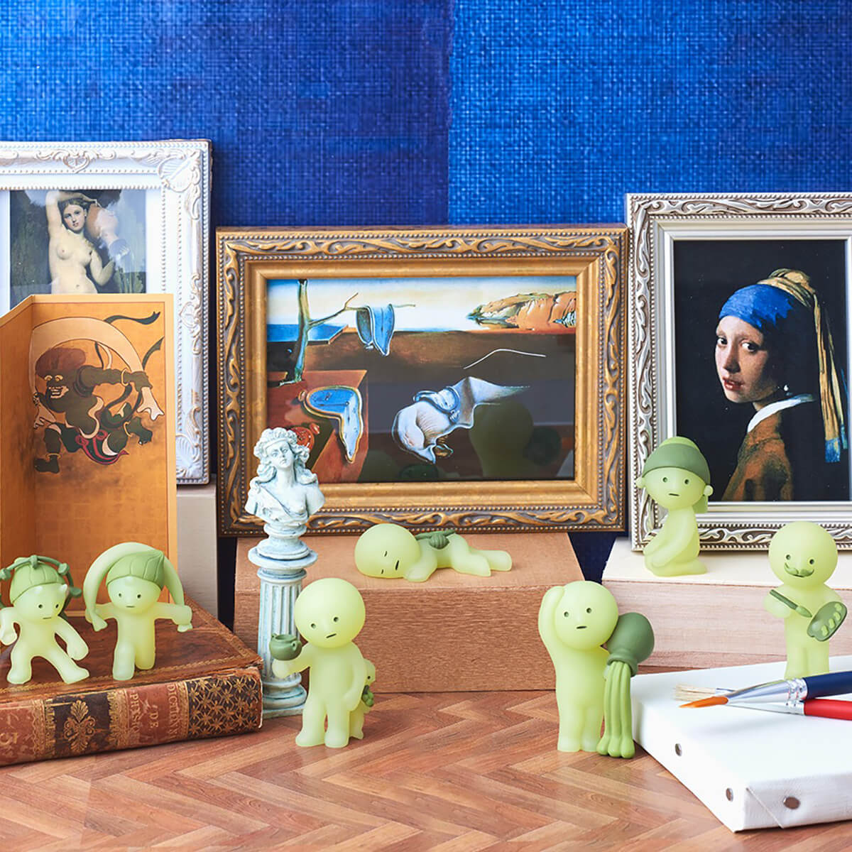 Smiski Museum Series collectable dolls. Smiski is a curious little creature that loves hiding in small spaces and corners of your room. Although they like to stay hidden, you might recognize at night as they mysteriously glow in the dark. In this Museum series, Smiski recalls famous works of art. In the dark, they glow, though nobody quite knows why. There are six different art inspired Smiskis in this series: Smiski Velazquez, Smiski Dali, Smiski Pearl Earring, Smiski The Source, Smiski Bacchus and Smiski Fujin and Raijin, plus the secret and rare Smiski Tutankhamun figure.