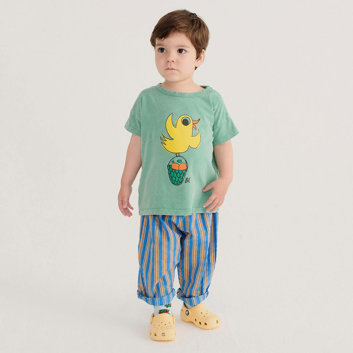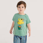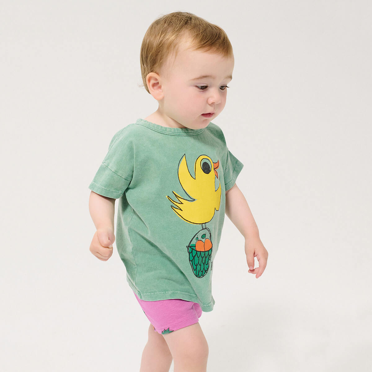 Flying Oranges Baby T-Shirt by Bobo Choses. Green tee designed with short sleeves, dropped shoulder, shoulder snap fastening, loose fit and a round neck.