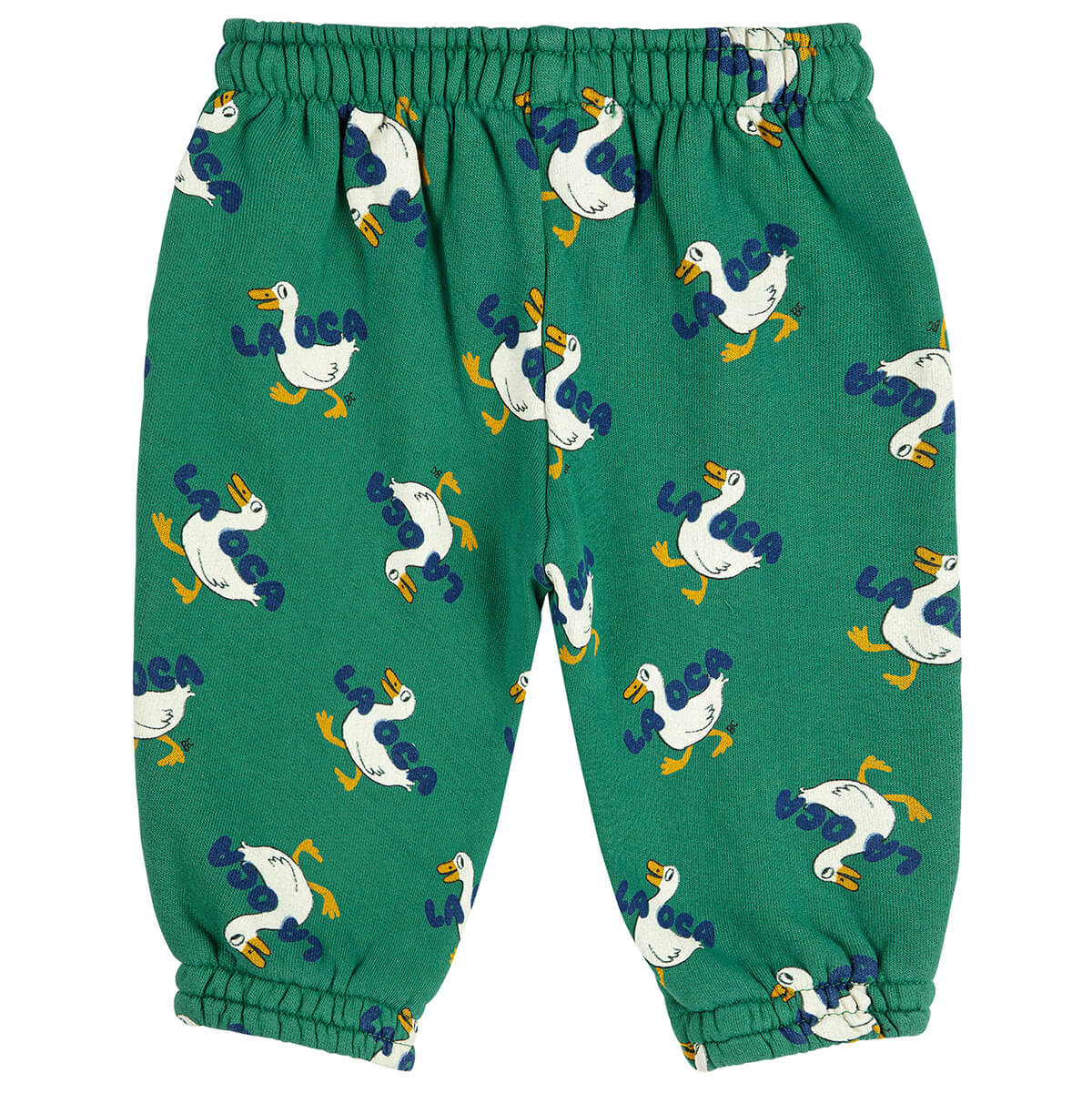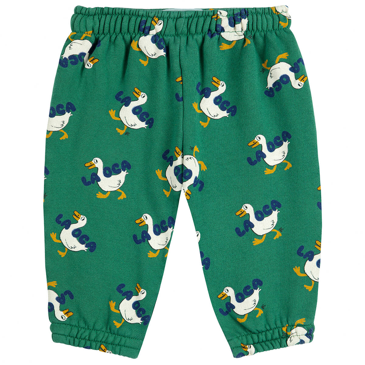 La Oca All Over Baby Sweatpants by Bobo Choses. Stylish and playful, these green joggers are designed for active little ones. They feature elasticated cuffs, an elasticated waistband and a baggy fit.