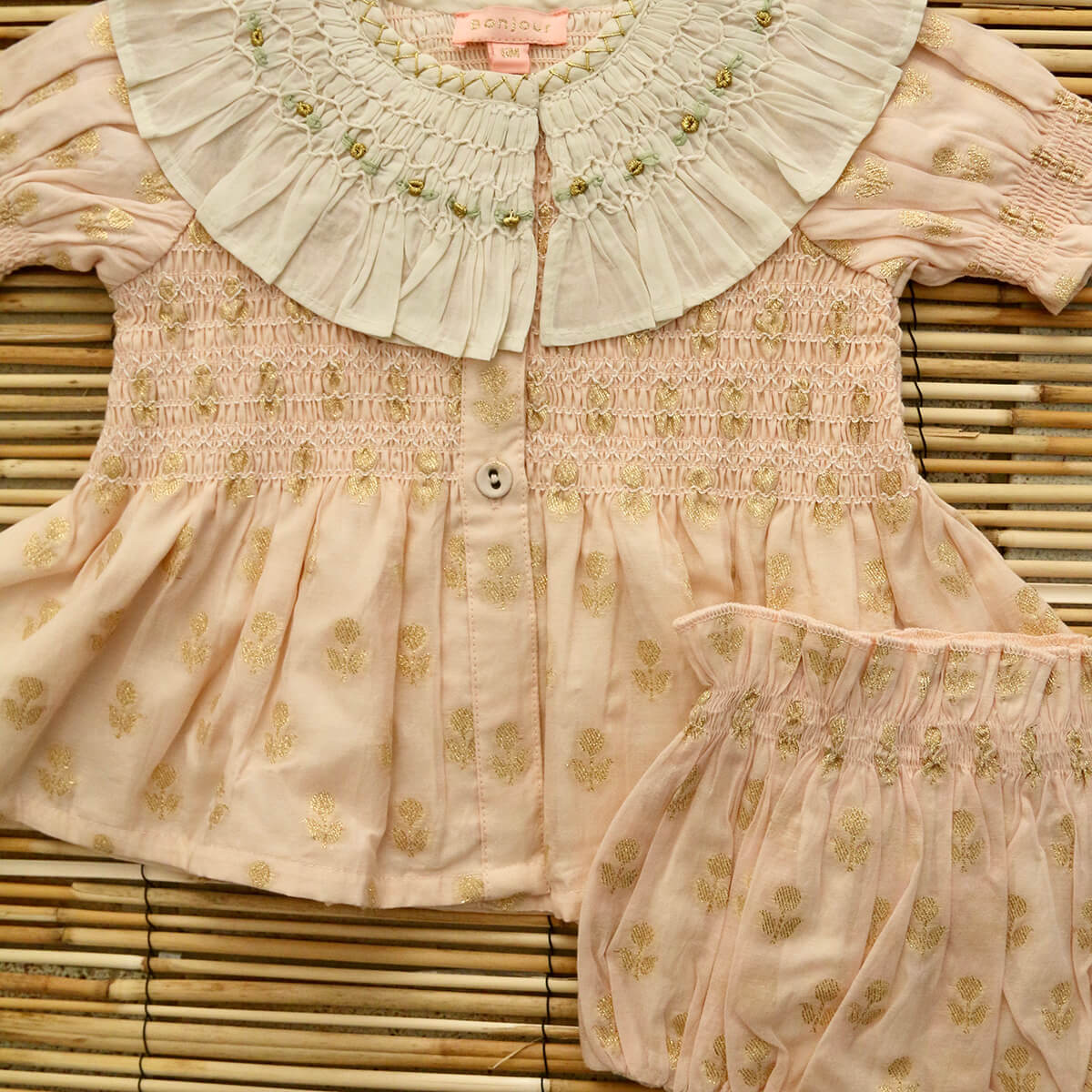 Baby Set by Bonjour. Hand smocked baby blouse with matching elasticated bloomers in petal pink. The pleated collar features hand embroidered flowers. The set is adorned with gold foiled flowers printed on lightweight, breathable Chanderi fabric.