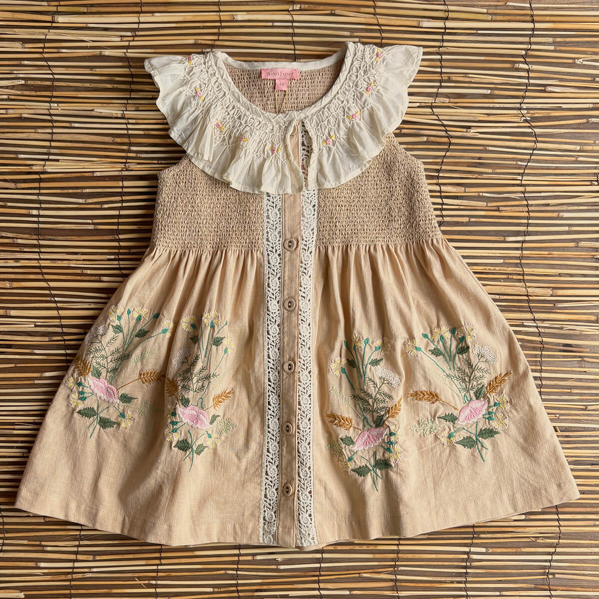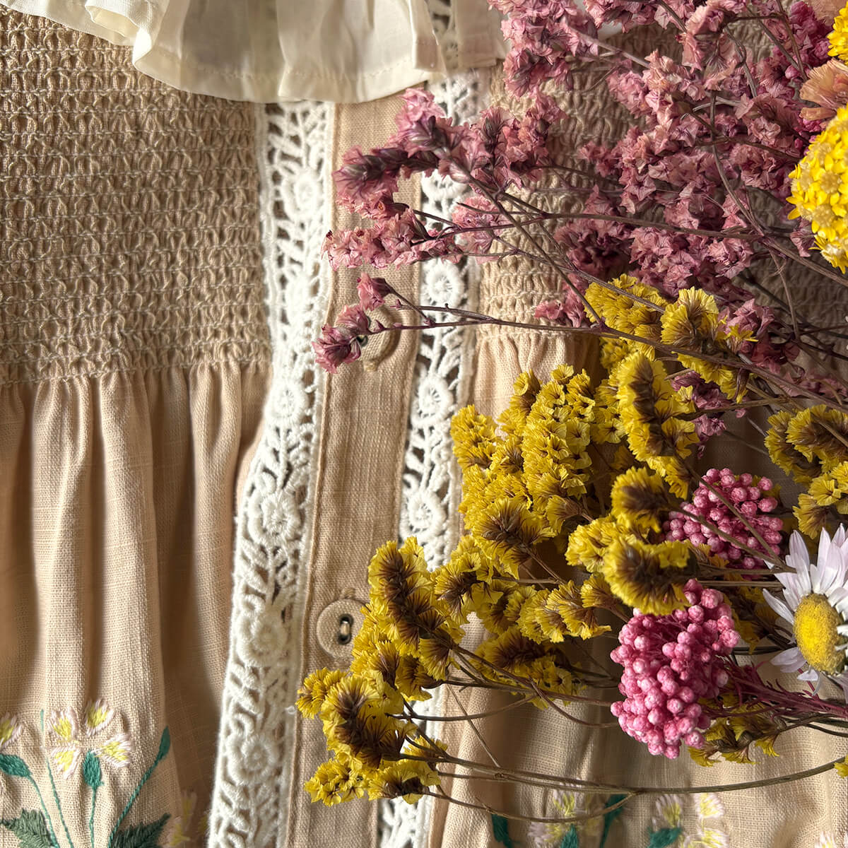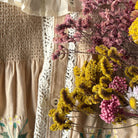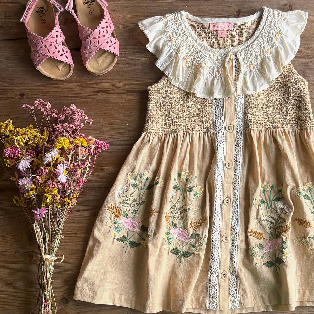 Embroidered Ibiza Top by Bonjour. This beautiful blouse or dress has elegent floral embroidery on the skirt, broderie anglaise lace button placket and a wide collar adorned with embroidered yellow flowers.