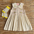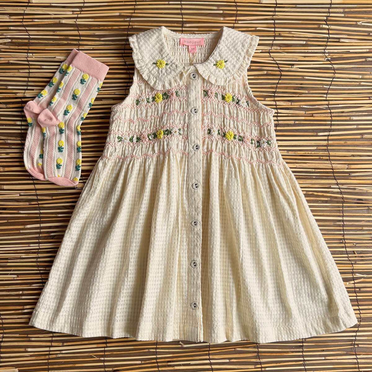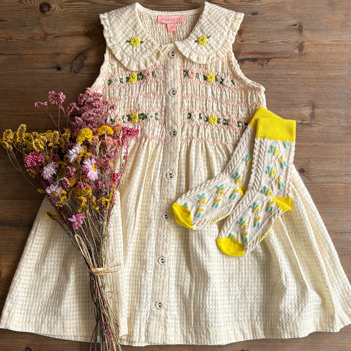Ibiza Top by Bonjour. This beautiful seersucker cotton blouse can be worn long as a dress or layered over leggings and pants. With a pretty frill edge collar and lemon yellow embroidered flowers. Bonjour's signature pink smocking on the bodice.