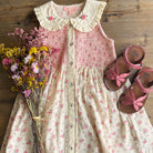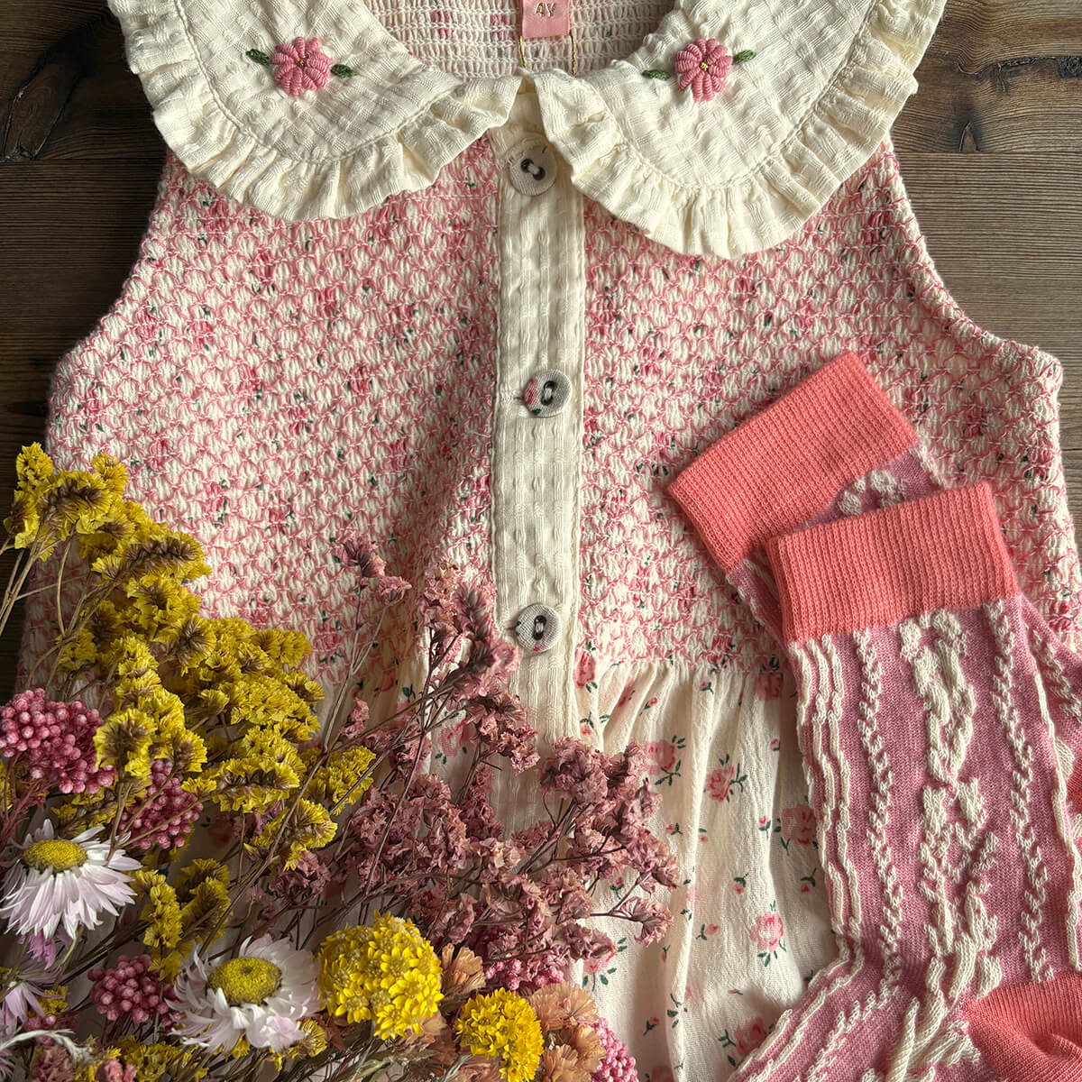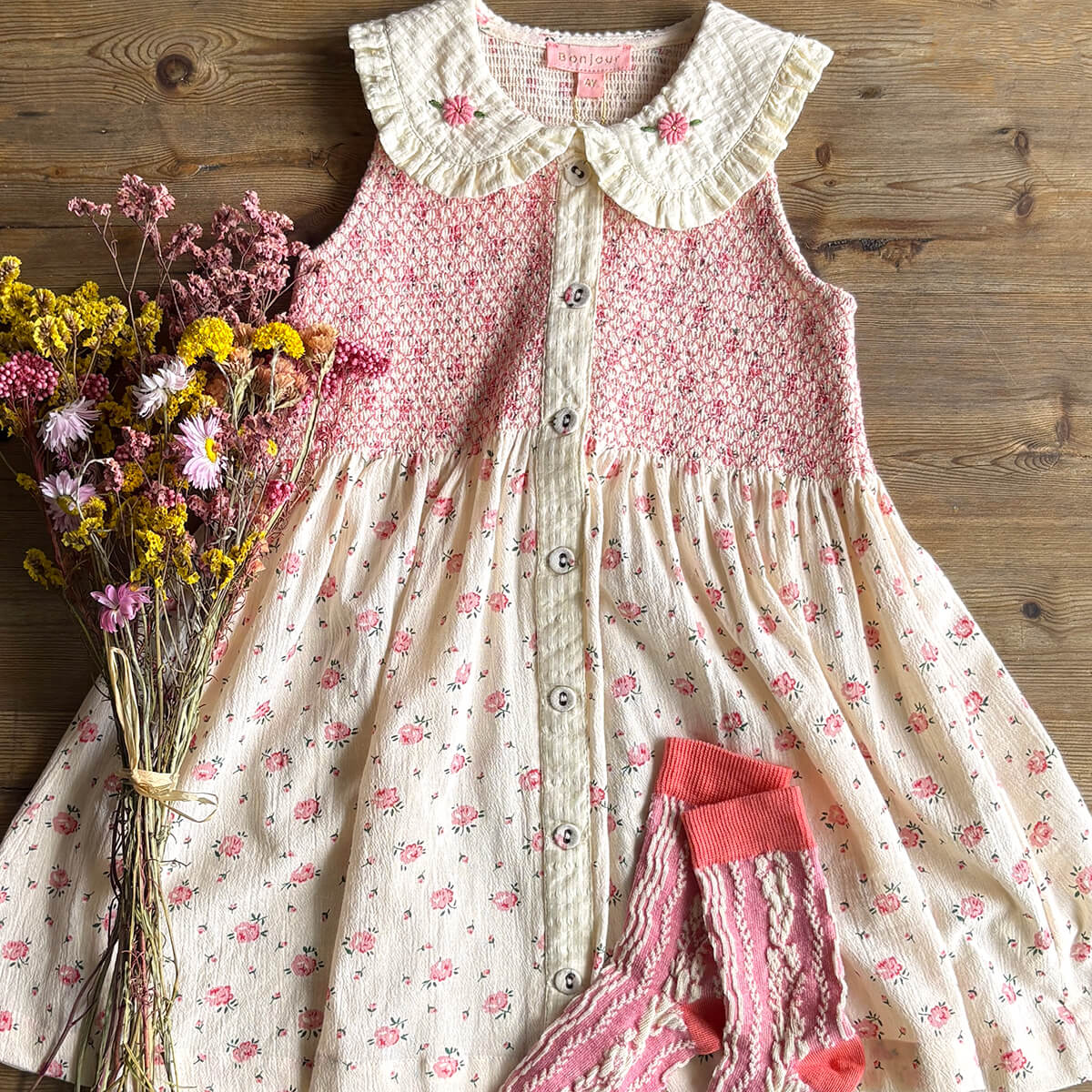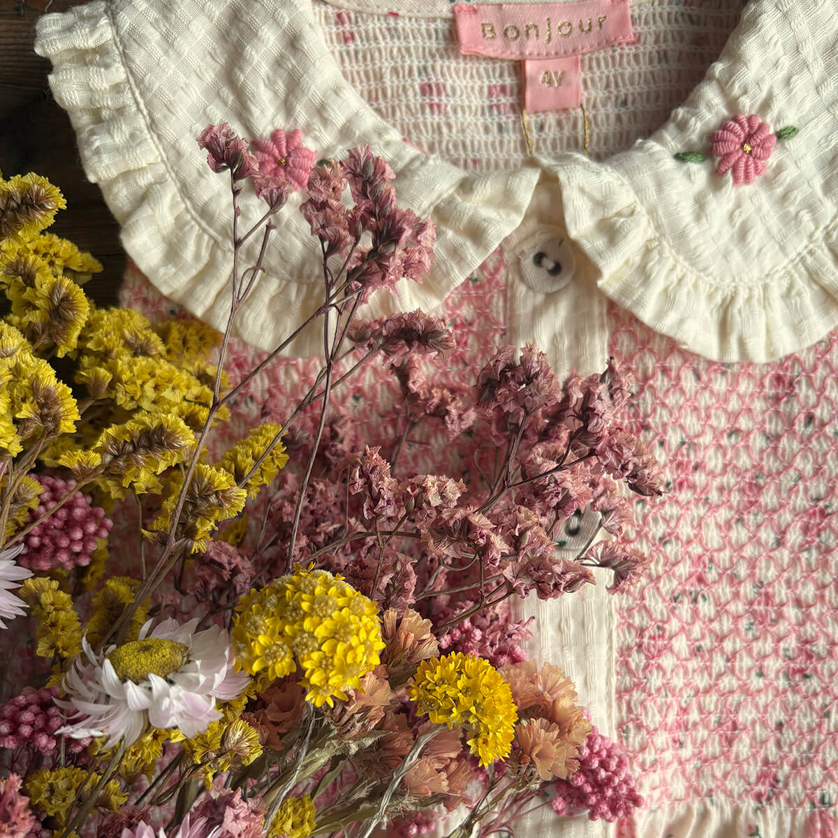 Ibiza Top by Bonjour. This beautiful blouse can be worn long as a dress or as a top over leggings or pants. In a seasonal Rosa Bloom floral print, featuring a seersucker cotton collar with pretty pink embroidered flowers and Bonjour's signature smocking in pink on the bodice.