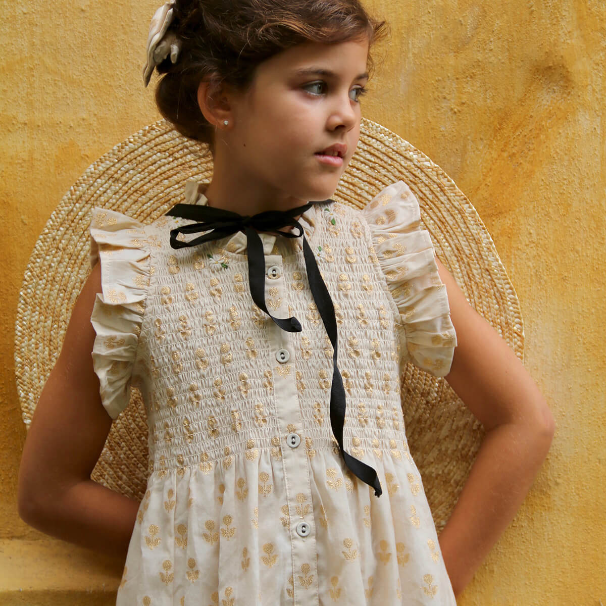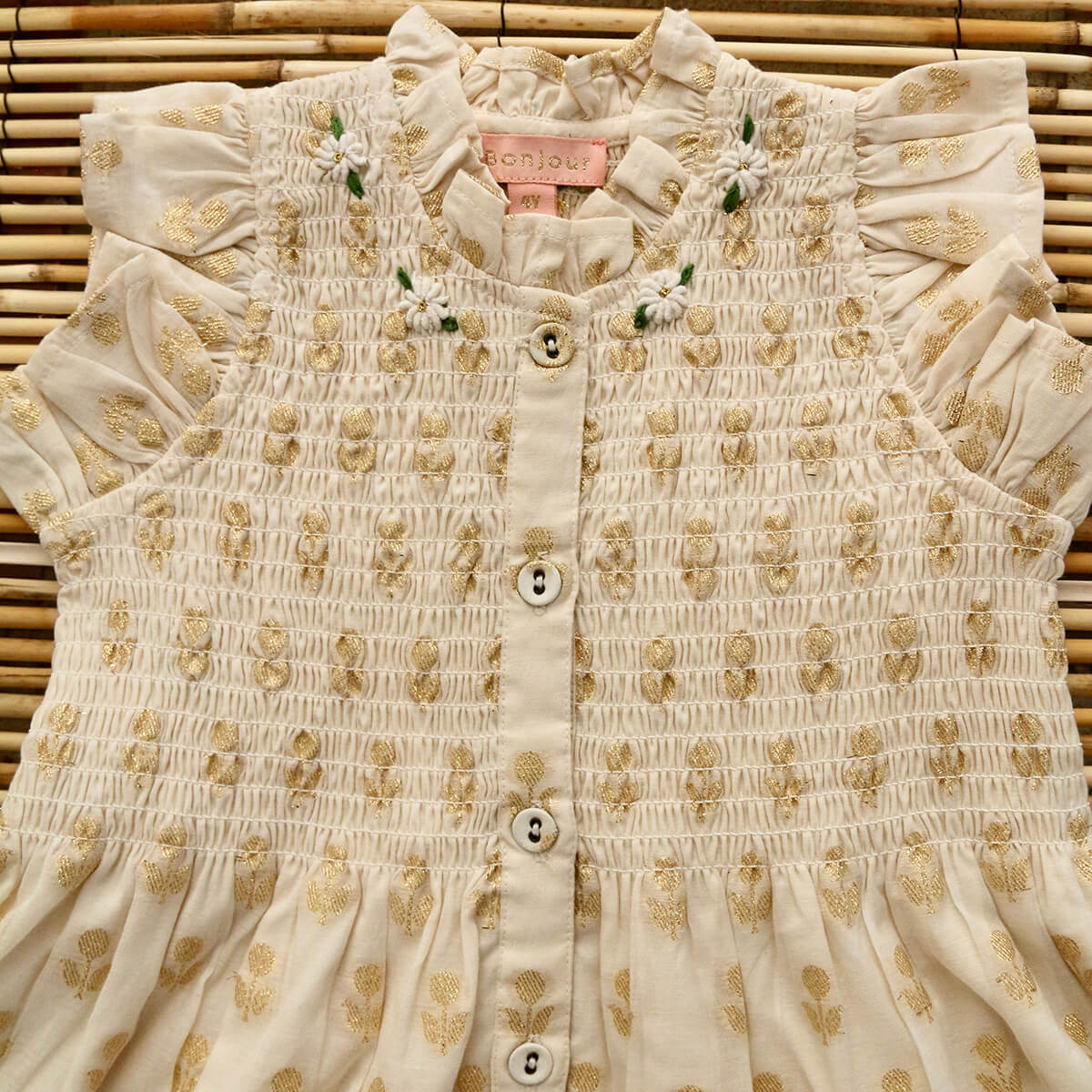 Ibiza Dress in Ivory & Gold Flowers by Bonjour