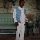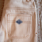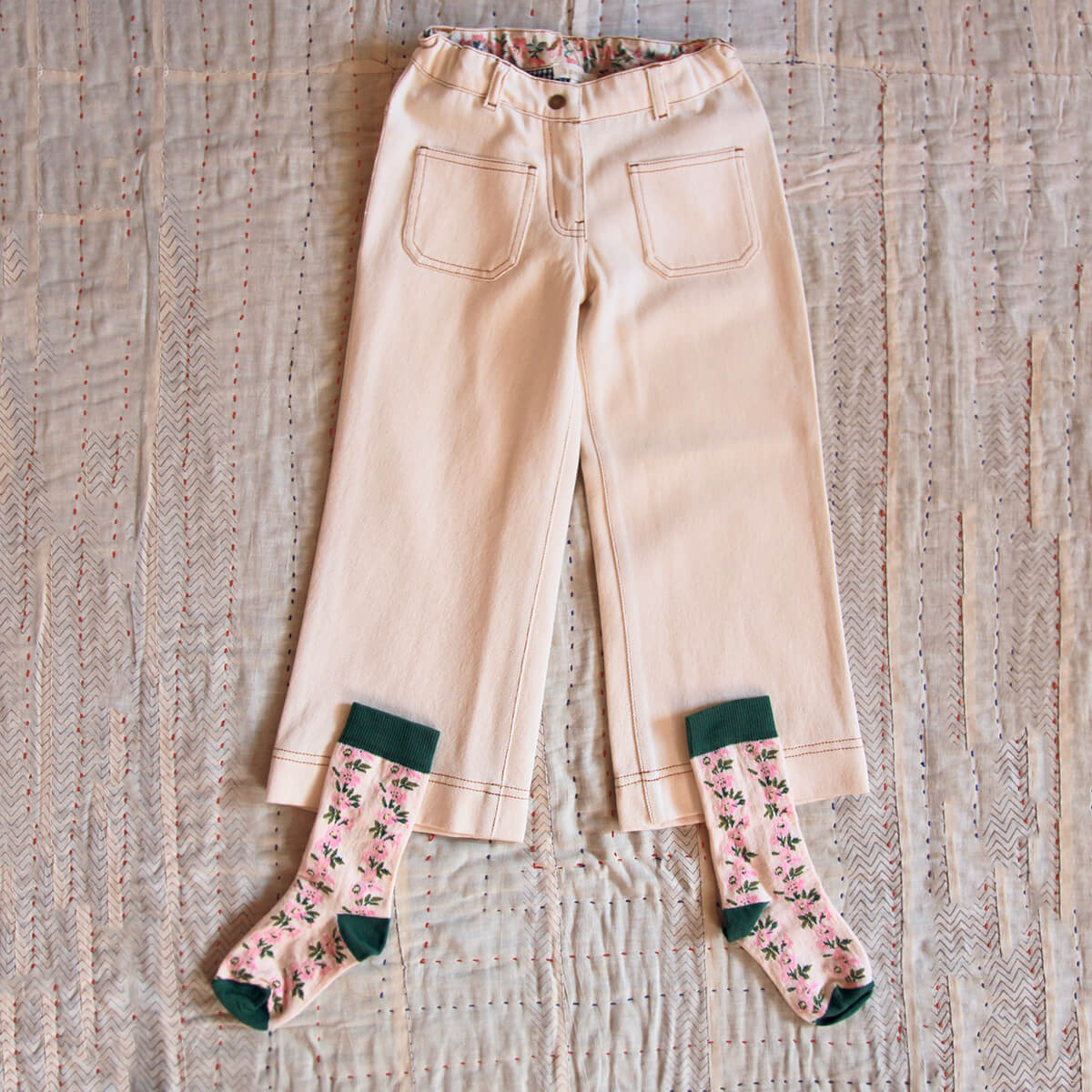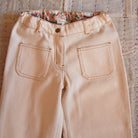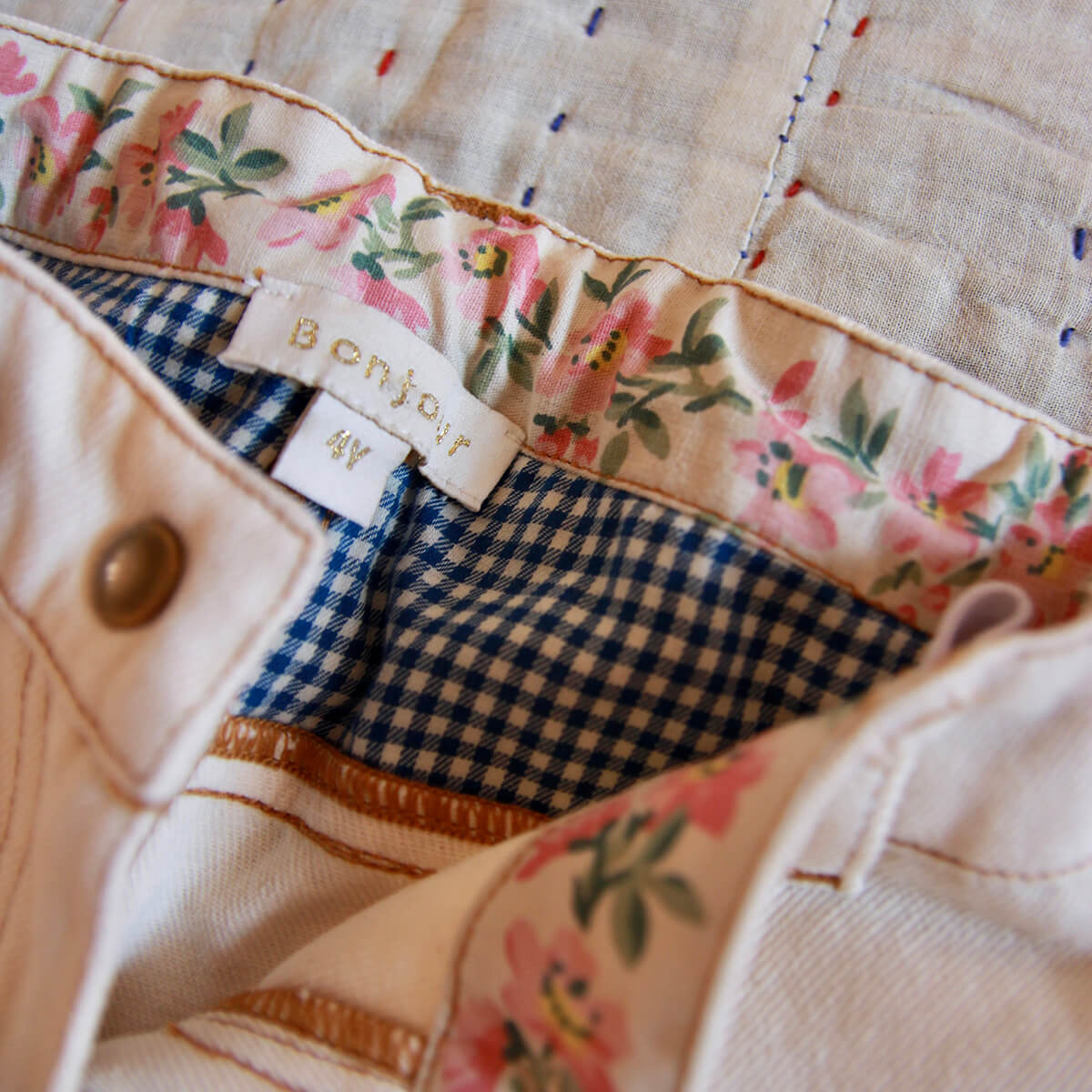 Pants by Bonjour. Wide denim trousers in ivory denim with a blue vichy check lining and farandole flower stripes belt lining. Featuring an adjustable elastic waist and Bonjour patch on the back pocket.