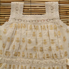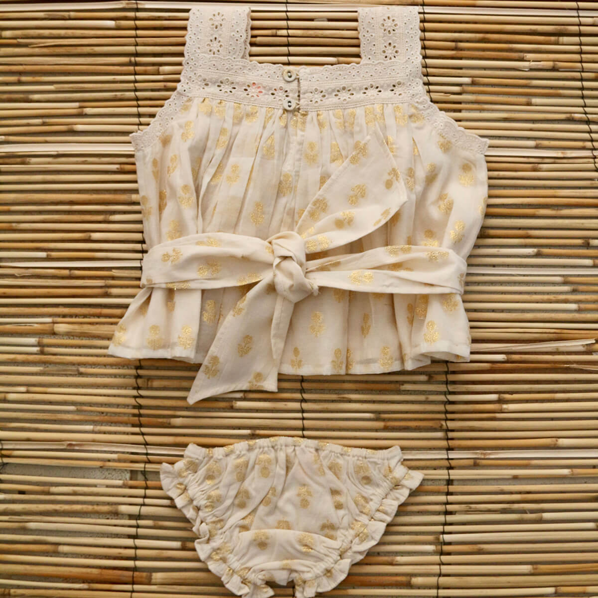 Top and Panty Set by Bonjour. A pretty sleeveless blouse with adjustable tie waist and broderie anglaise at the neck and straps. Complete with matching frilled edge panties. Adorned with gold foiled flowers on lightweight Chanderi fabric.