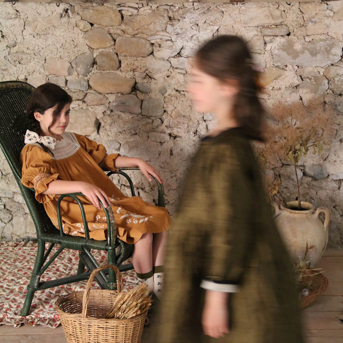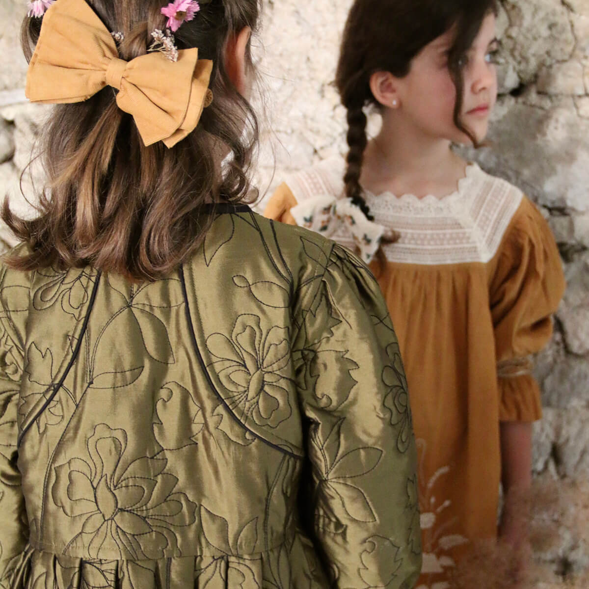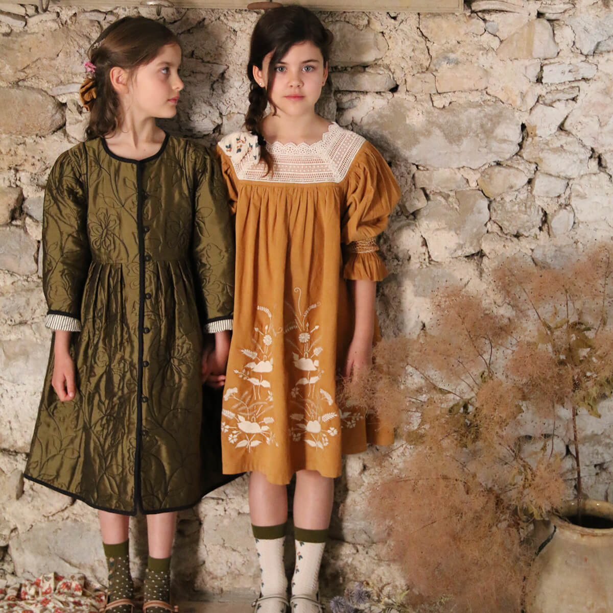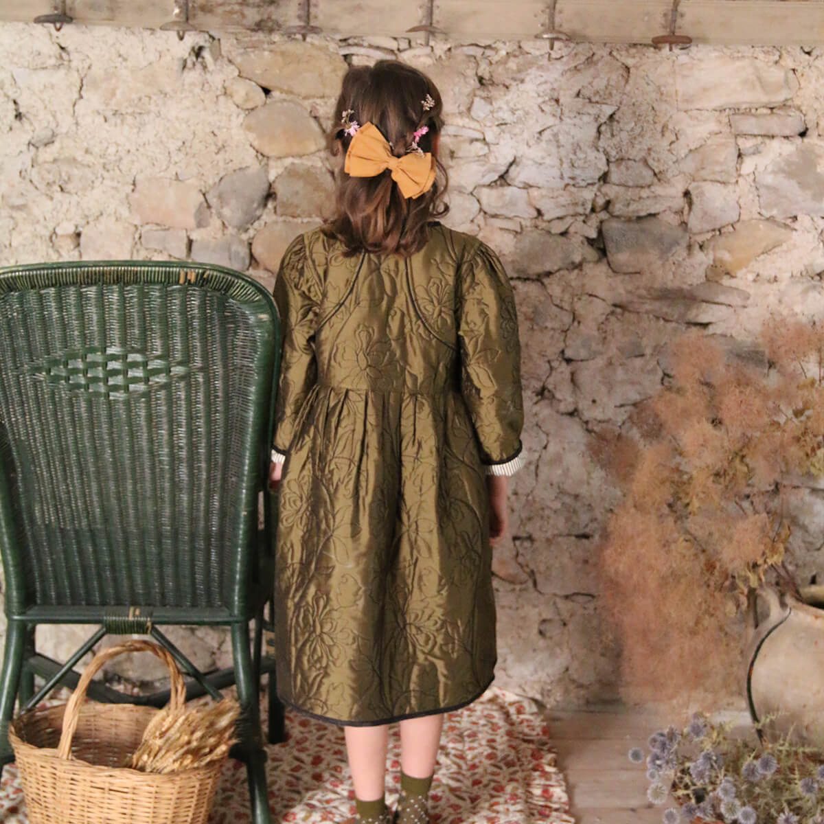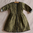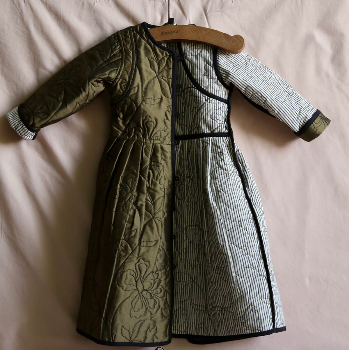Dress Coat by Bonjour. Long quilted jacket with black cotton voile piping and a black and white stripe lining.