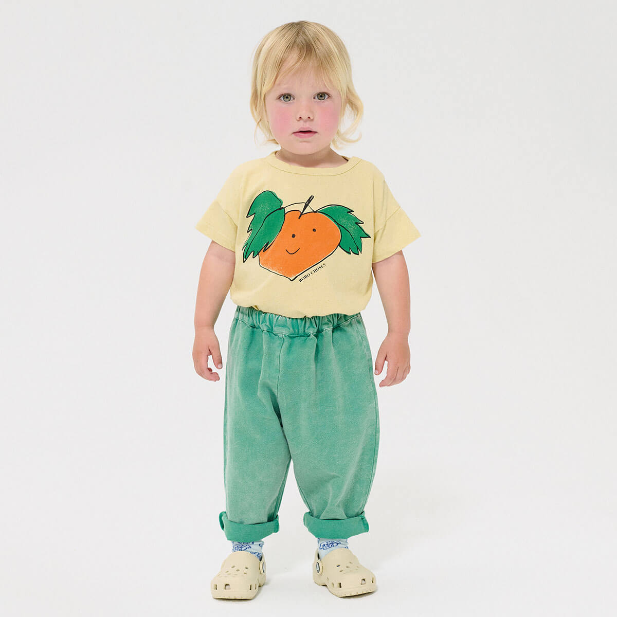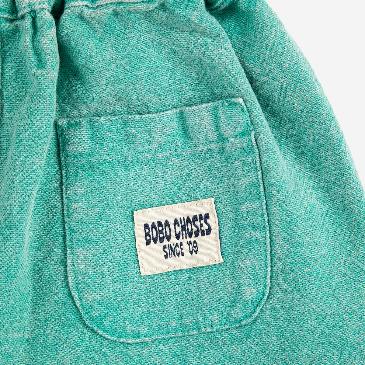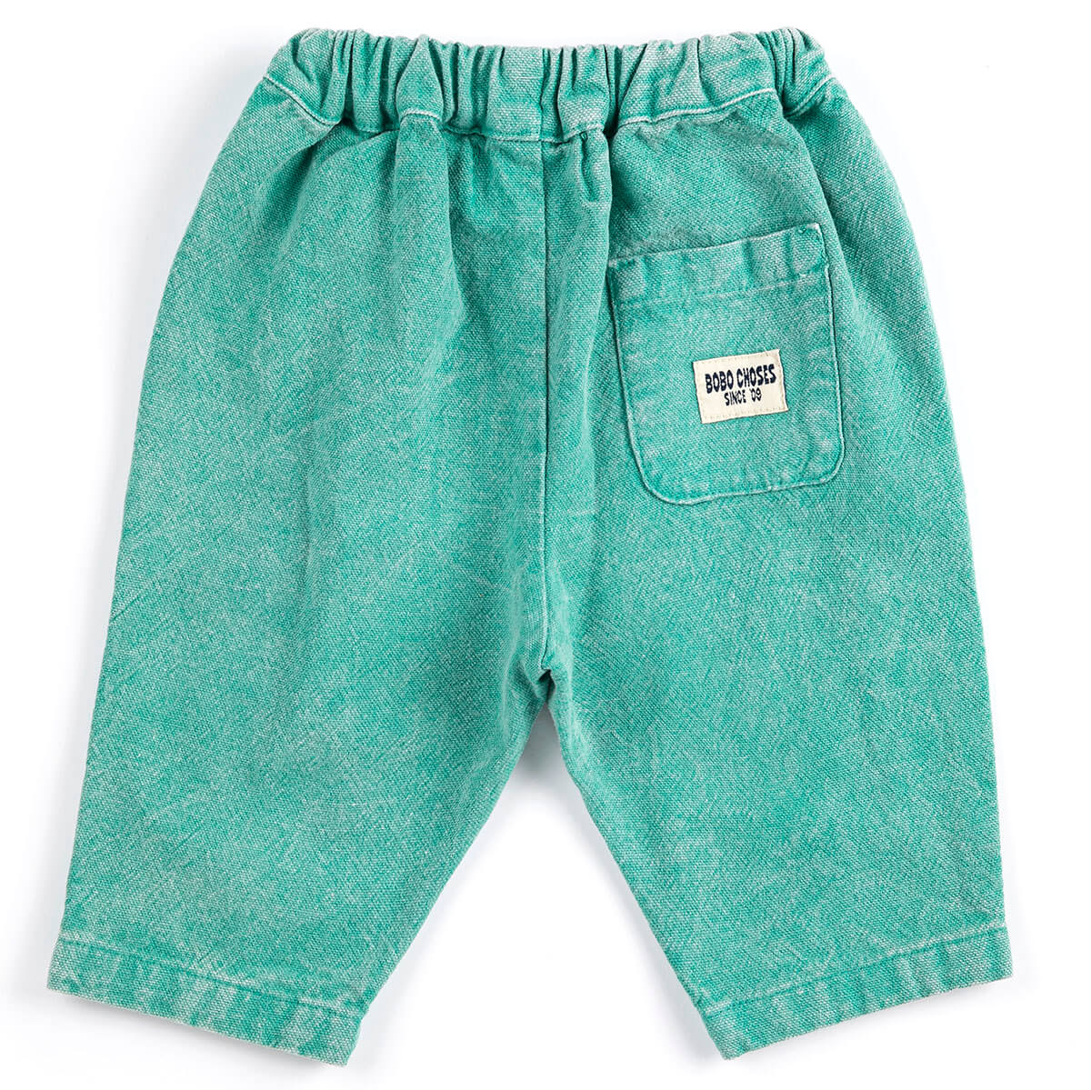 Bobo Choses Since 09 Woven Baby Pants by Bobo Choses. Green trousers featuring an elasticated waistband with adjustable drawstring, baggy fit, ankle length and a patch pocket.