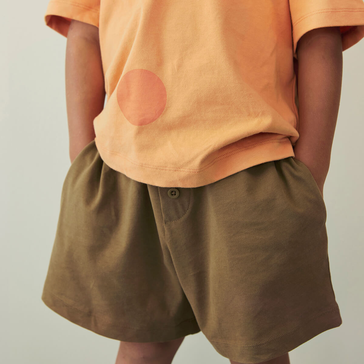 Button Shorts by Gray Label. Made from soft organic cotton jersey, these longer length shorts have 3 front buttons and the Gray Label logo embroidered on the back.