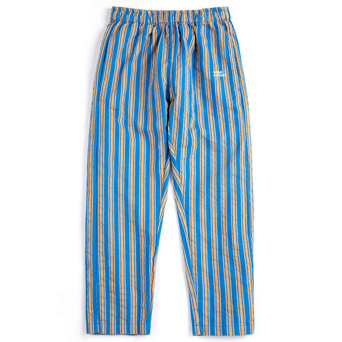 New Hairline Woven Pants by Bobo Choses. Navy blue striped trousers designed with an elasticated waistband, baggy fit, long length and seam pockets.