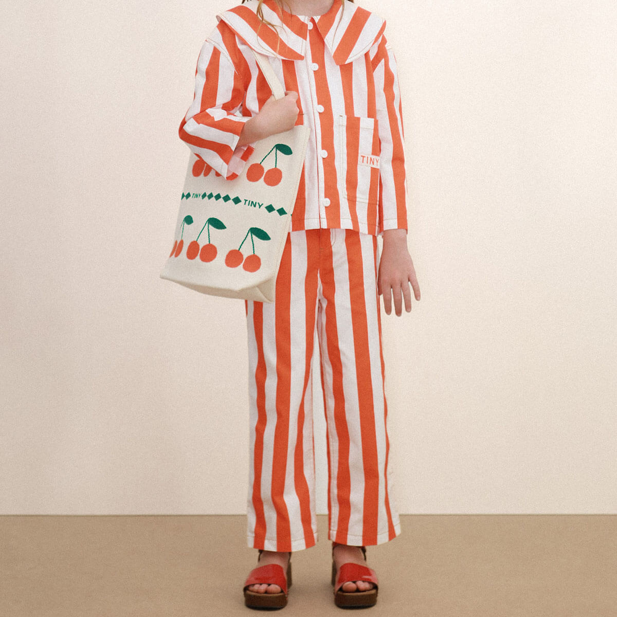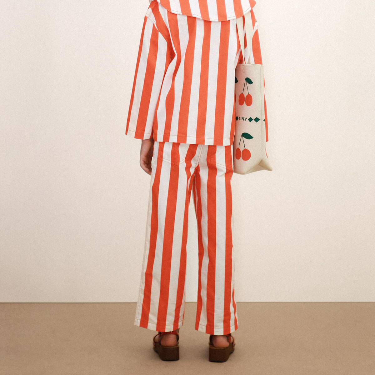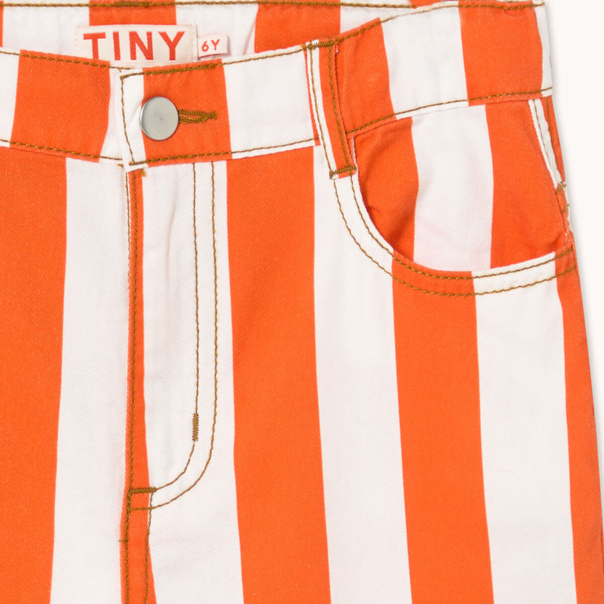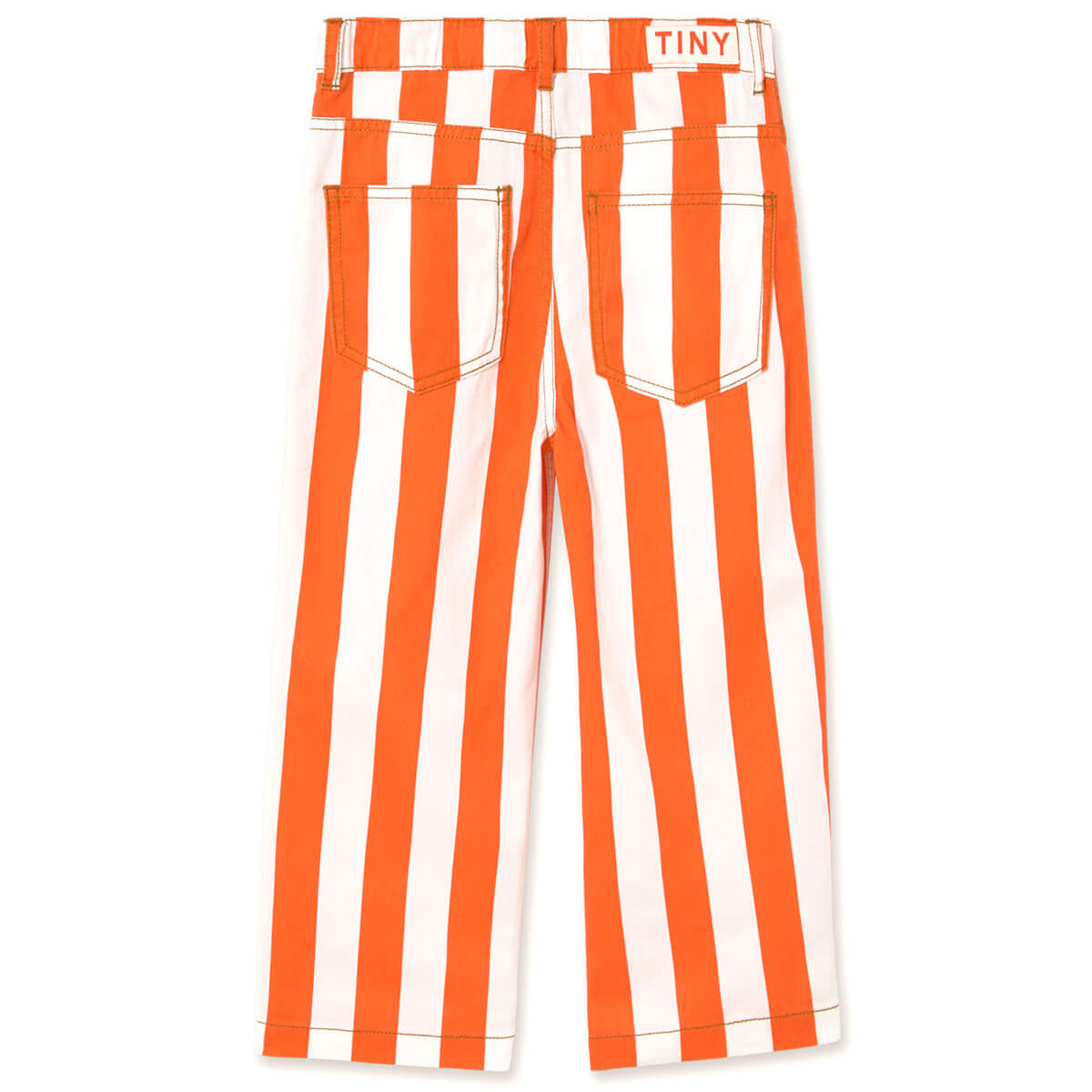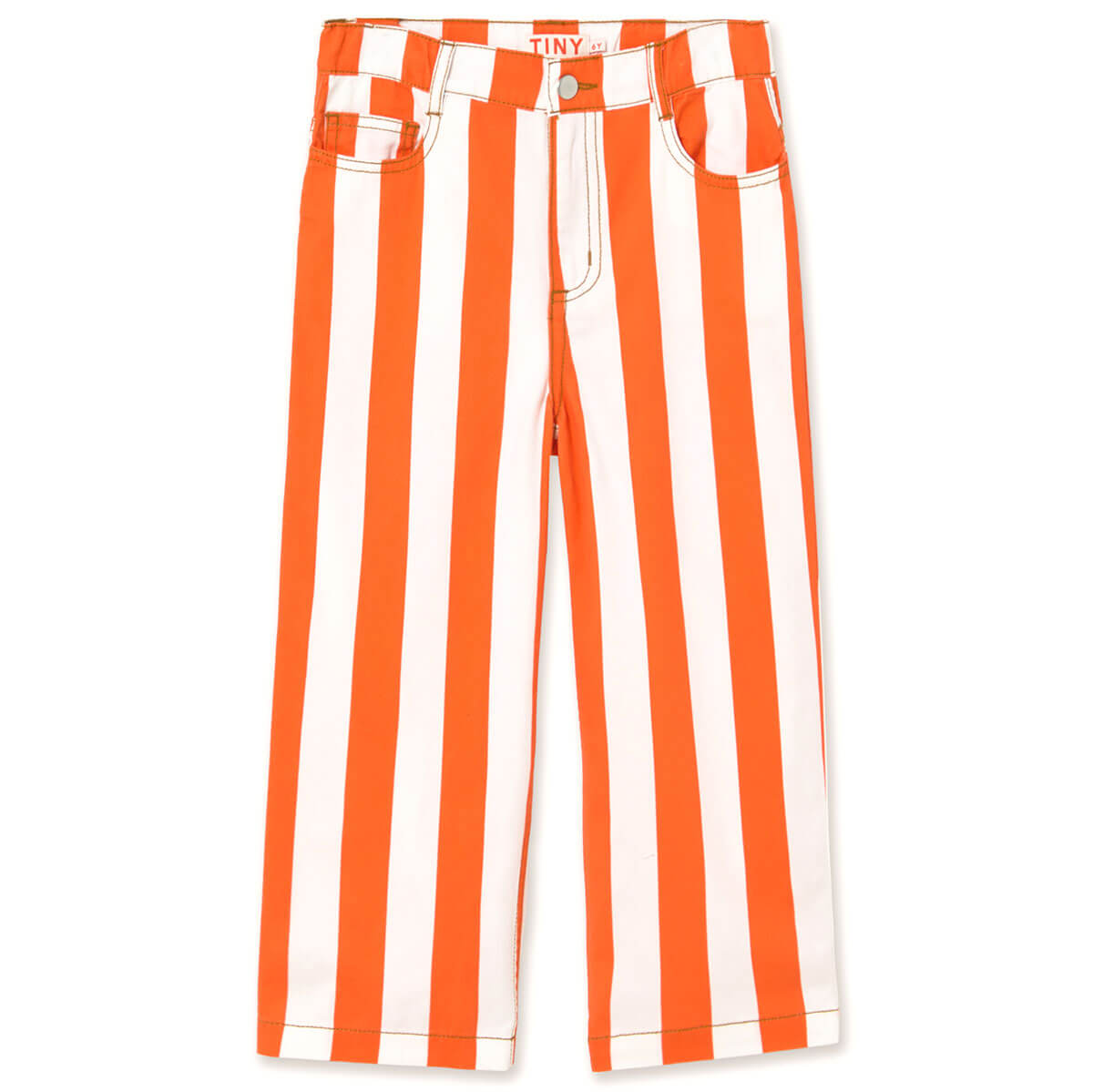 Stripes Twill Jeans by Tinycottons. These classic cut long pants in soft light twill fabric with an off white base and summer red stripes combine elegance and comfort in a versatile design. They feature a waistband with belt loops and a snap button closure, front internal pockets, and back pockets, offering functionality without compromising style. Perfect for casual looks or slightly dressier occasions.