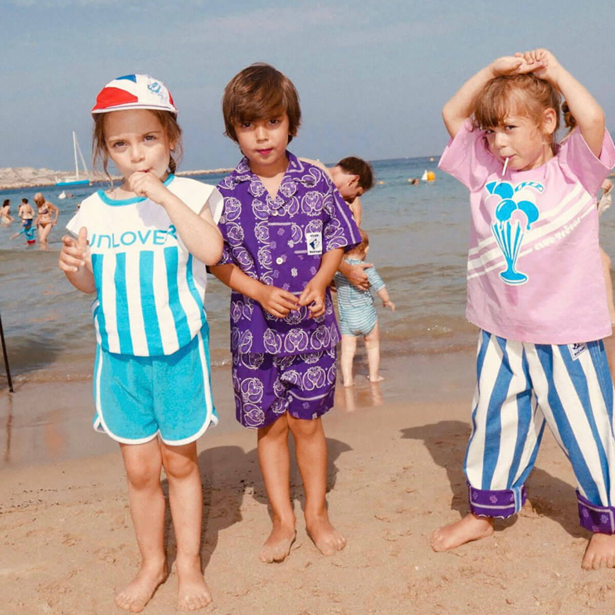 commitment to sustainability. They design collections in limited series using only deadstock fabrics: no new materials, no waste. Made in France and Portugal, their pieces feature evolving fits so kids can grow into each piece. Prints are inspired from vintage graphics from the 70s to the 90s.