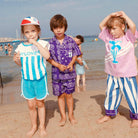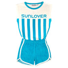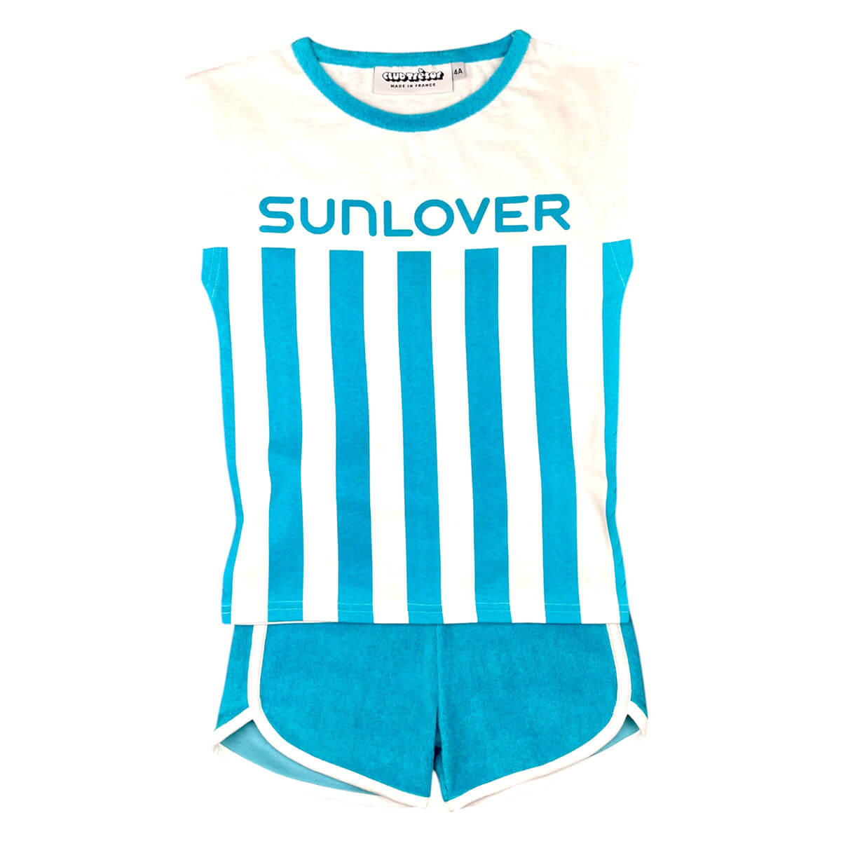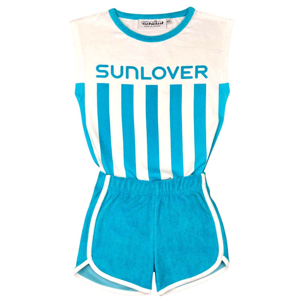Sunlover Set by Club Trésor. The unisex T-shirt and shorts set is designed to last two summers. The tee is made from 100% cotton jersey, and the matching shorts from 100% cotton terry, offering a soft, breathable texture. Inspired by a 70's cut, it combines comfort, vintage style and durability. Printed using an enviromentally friendly water-based technique. Made in Portugal, near Porto, from dormant stock fabrics.