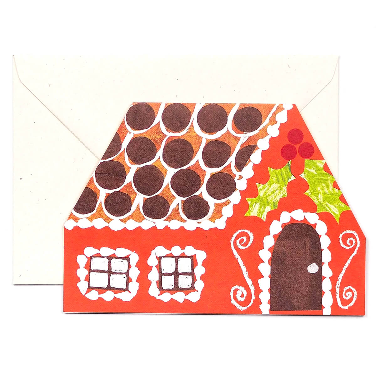 Gingerbread House Christmas Greetings Card by Hadley. A sweet gingerbread house card - cut to a house shape for extra cuteness.