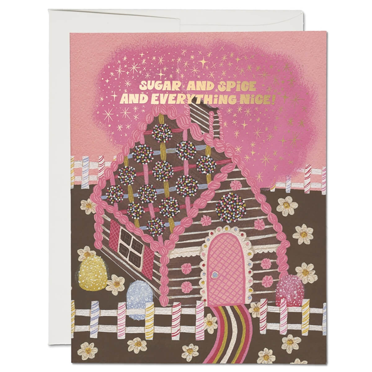 Gingerbread House Christmas greetings card by Red Cap Cards. Features an illustration by Krista Perry. Printed in the USA on heavyweight card stock.