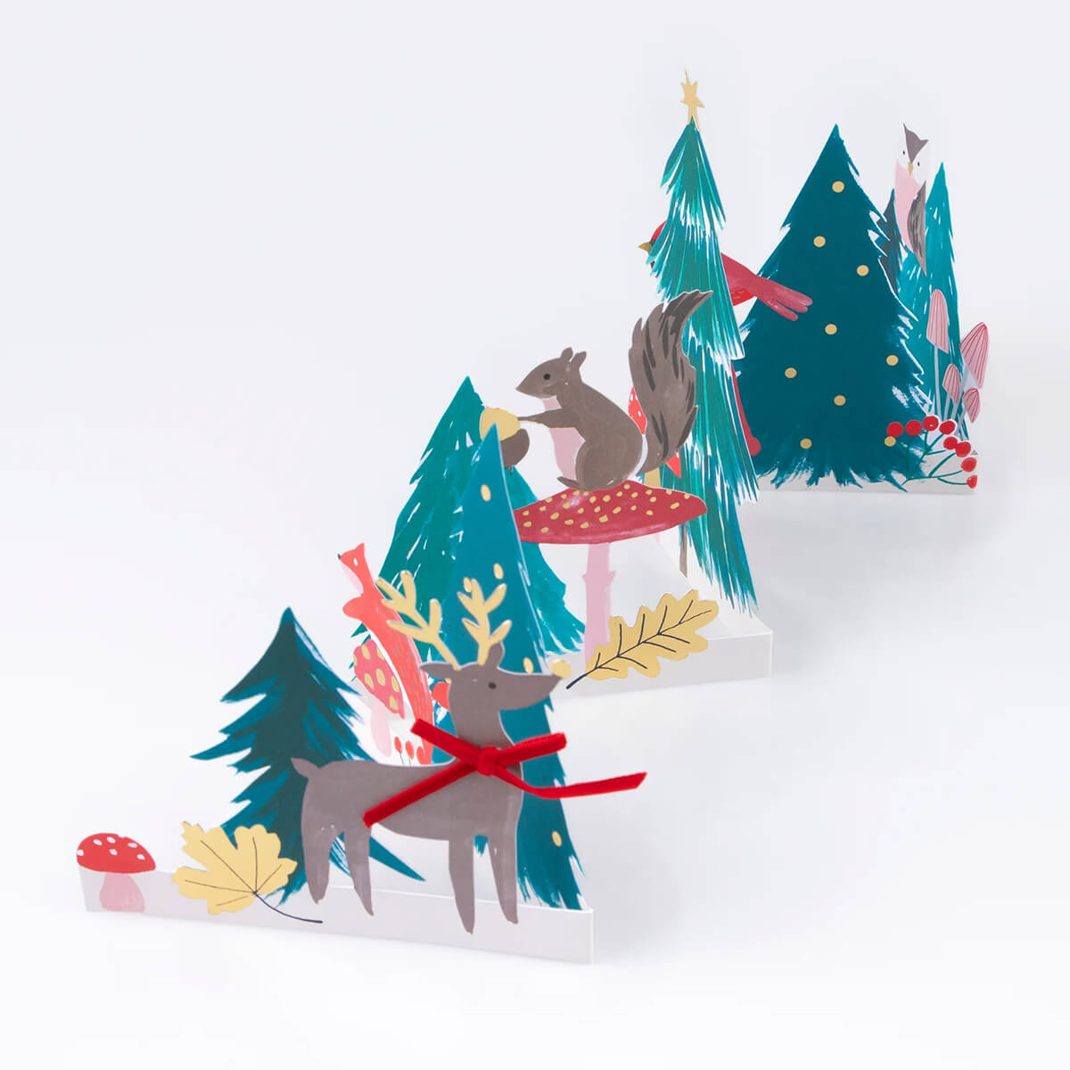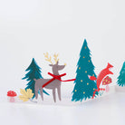 Winter Woodland Fold Out Card by Meri Meri.  Why have a plain card when you can have one that opens out into a striking Christmas decoration on your mantel? This card, featuring winter woodland flora and fauna and a shiny gold foil star topped Christmas tree, is perfect to send your best wishes to a special someone. The beautiful bow on the reindeer's neck adds a wonderful touch too, making this a Christmas display you'll want to bring out year after year.