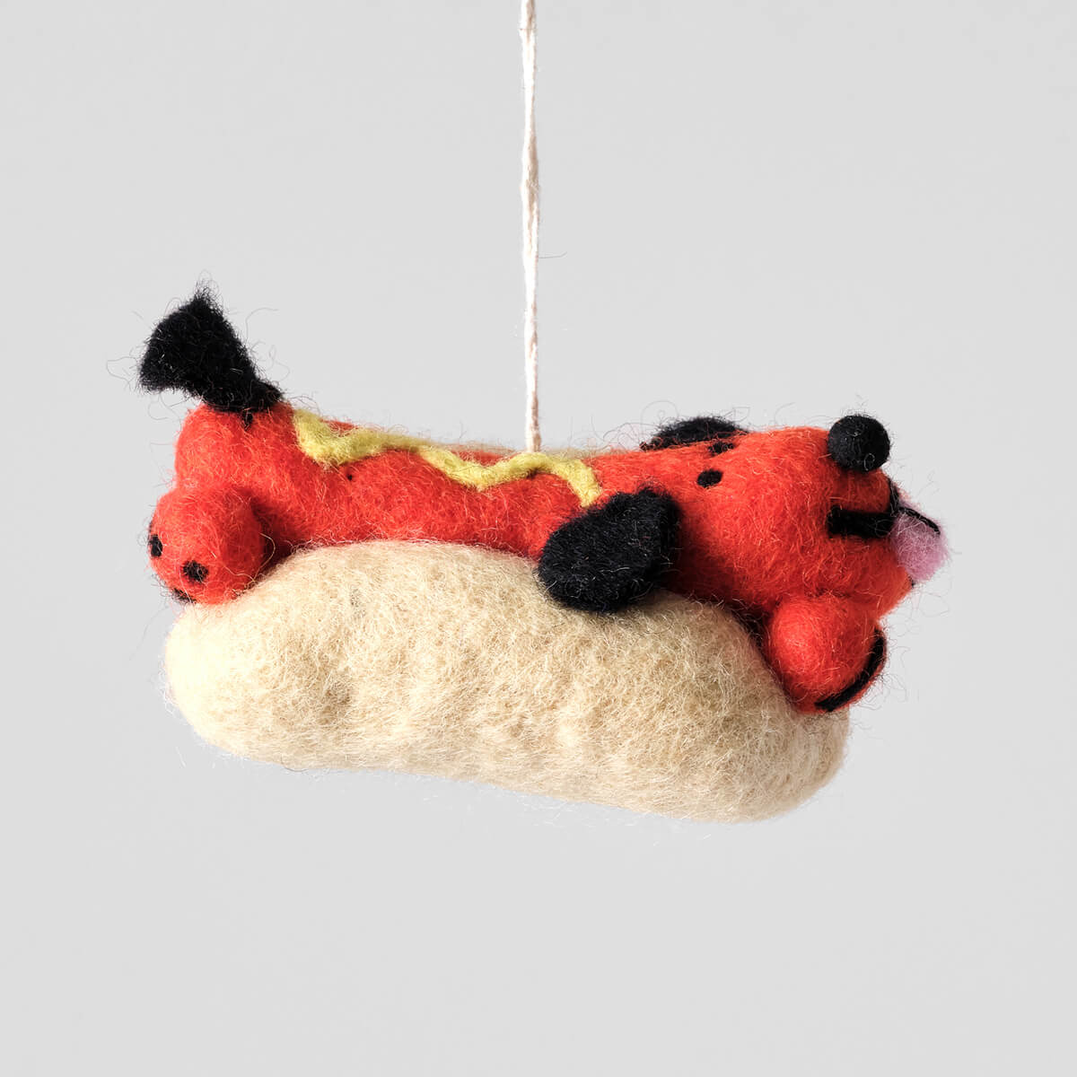 Frank Hotdog Dog Felt Decoration by Wrap. Hand needle felted hanging Christmas tree decoration. Frank the the dog has dressed up as a hotdog.