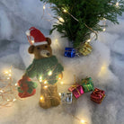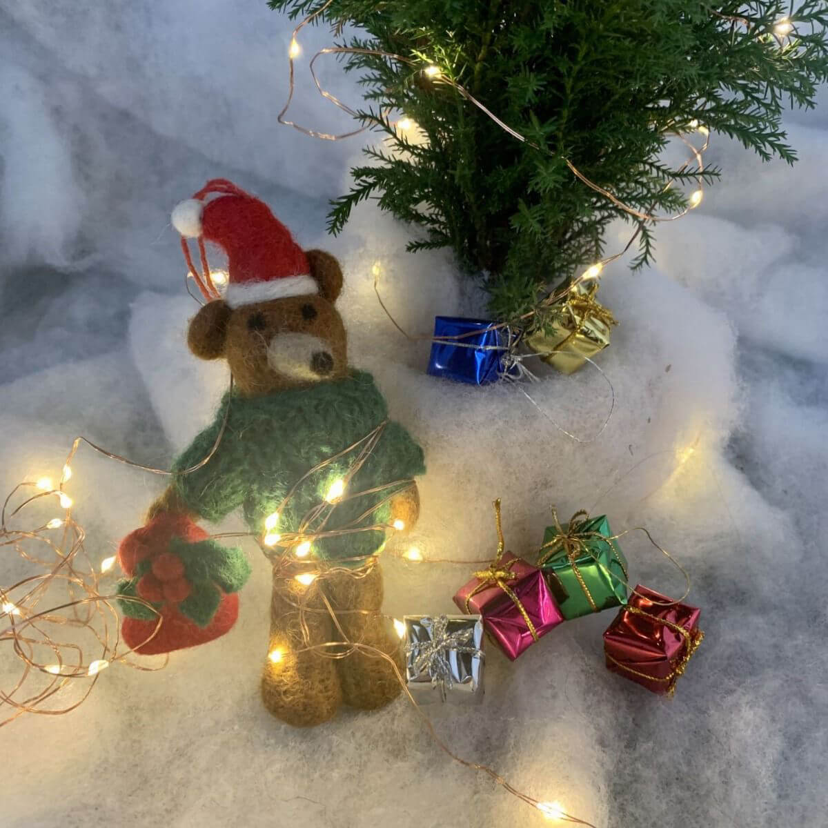 Claus The Christmas Bear hanging decoration by Felt So Good. It's Claus the Christmas Bears favourite day of the year - Christmas Eve! He's got his gorgeous holly green handknitted jumper on, with a festive Santa hat perched on his little head. In his paw he holds his Christmas stocking, hopefully Father Christmas has plans to fill it up with tasty treats and gifts later tonight! Handcrafted using traditional needle felting techniques from sustainable and eco-friendly materials.