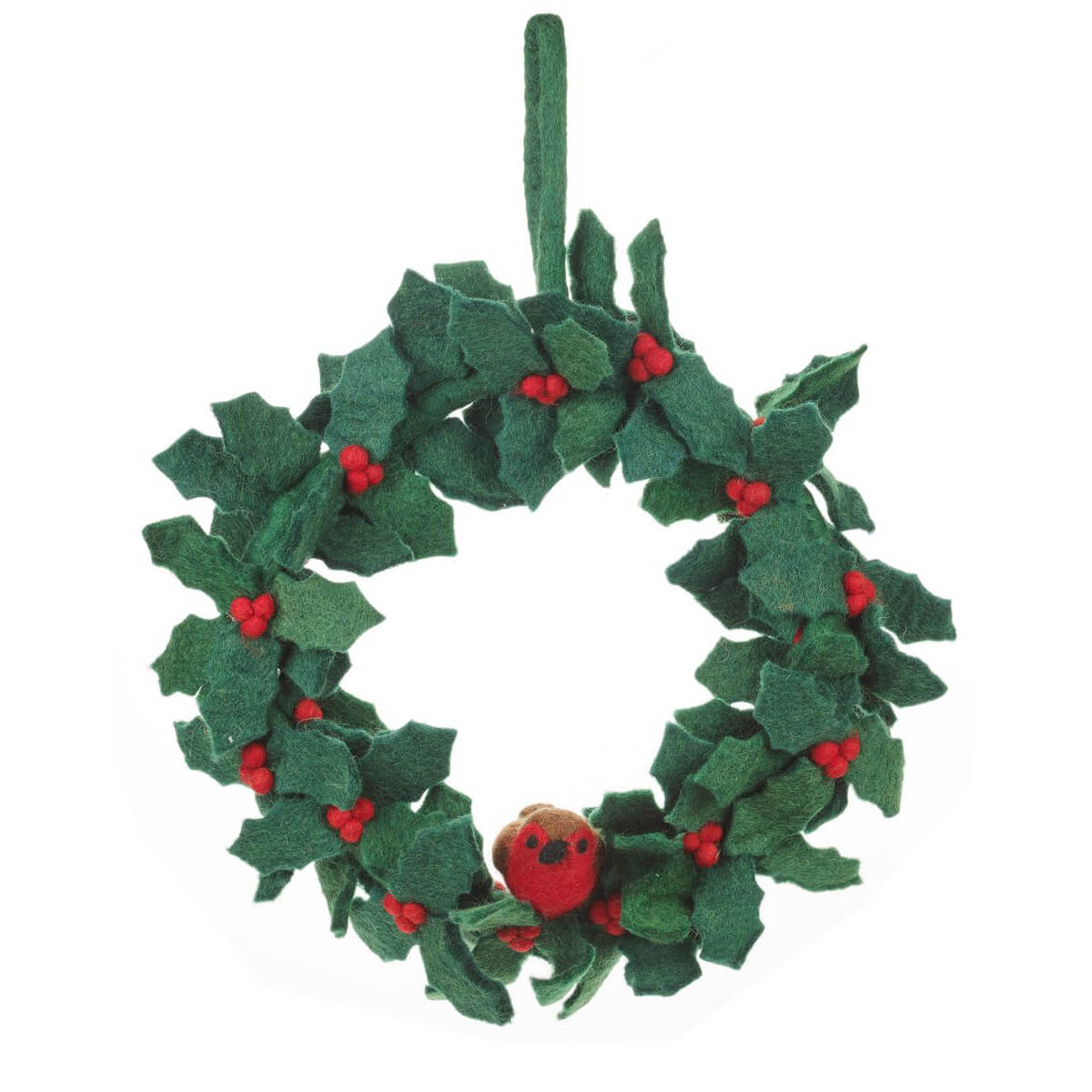 Holly and Robin wreath Christmas decoration by Felt So Good. A beautiful alternative to a traditional Christmas wreath. This stunning Holly Wreath is made from biodegradable, handmade felt coloured with natural and organic dyes. Hand stitched together onto wire and complete with an adorable little red robin perched in the centre. This truly special decoration is one you'll look forward to getting out each Christmas for years to come.