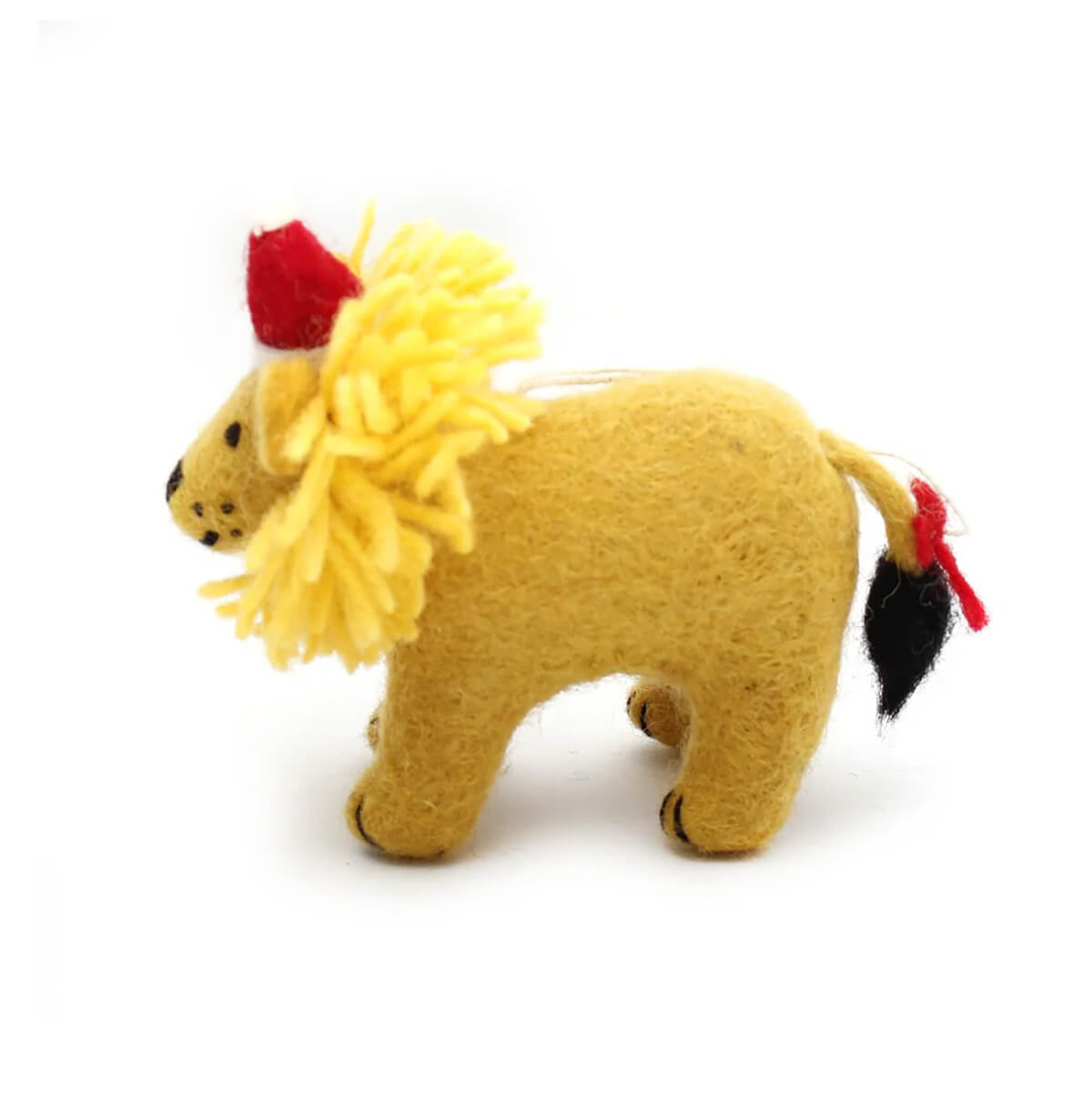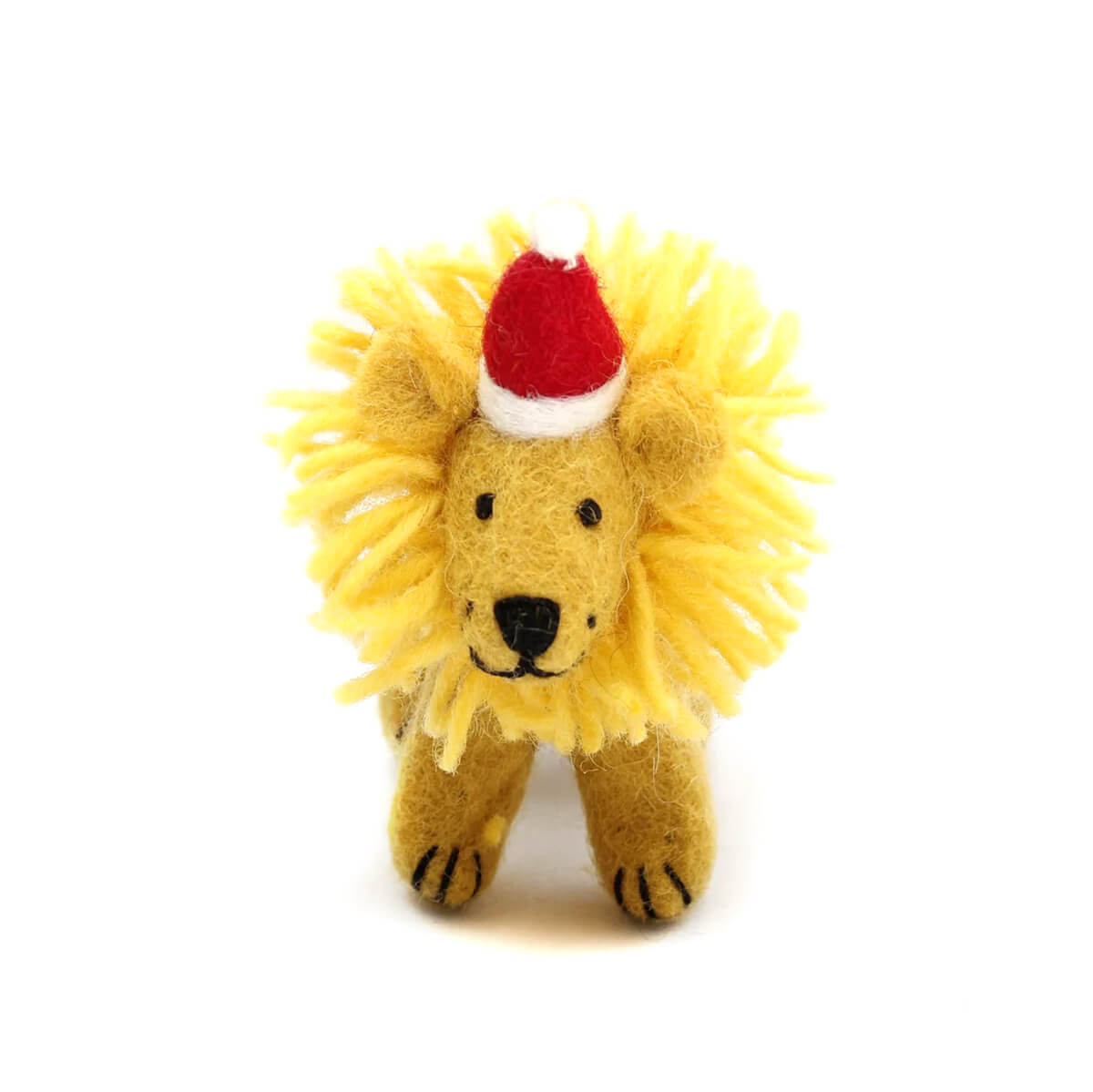 Lion in a Christmas hat hanging decoration by Amica. The pride of the Savanna is feeling Christmassy! A gorgeous lion decoration with his Christmas hat on and red bow on his tail. A beautiful, handmade and fair trade felt decoration.