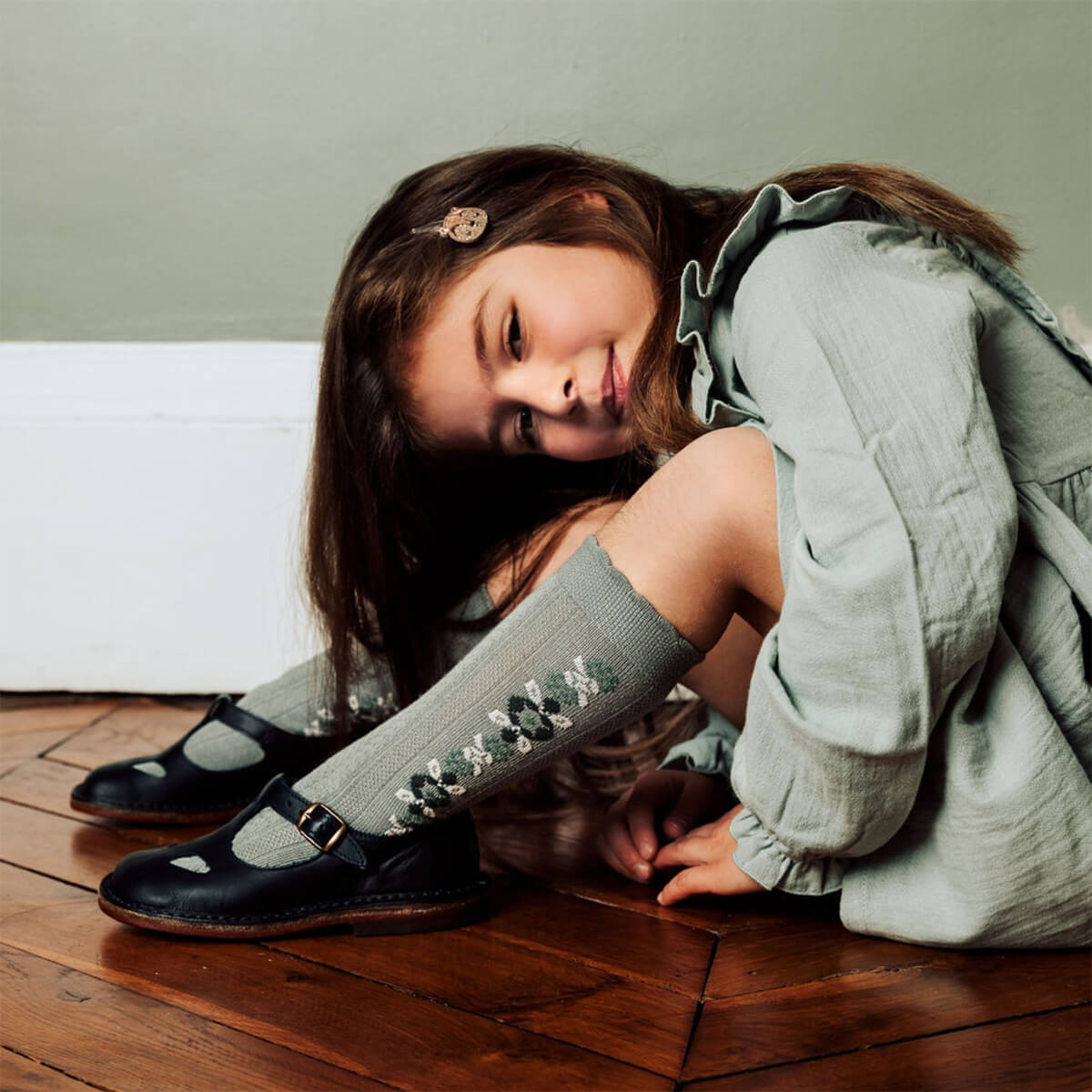 Dalia Jacquard Flower Knee High Socks in Aigue Marine by Collégien. These socks have a sweet embroidered flower detail and are timelessly stylish. The cuff is stretchy but not tight, so they will stay put but you will barely notice they are there.