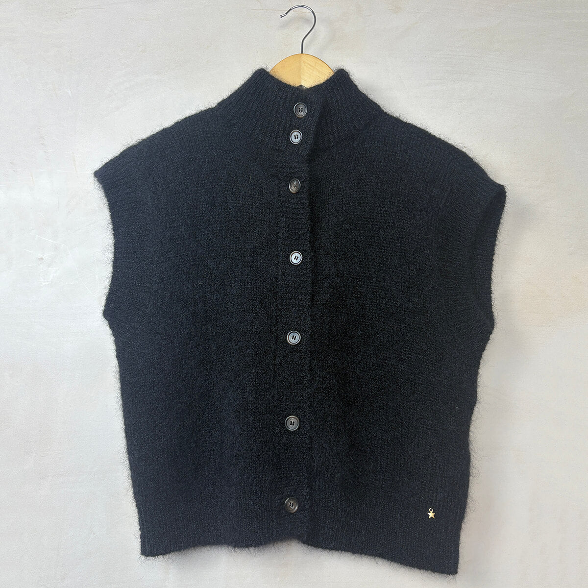Alibou Cardigan by Des Petits Hauts. This chic, eye-catching and versatile sleeveless cardigan is made from kid mohair and merino wool. A fluffy knit to layer over your tops.