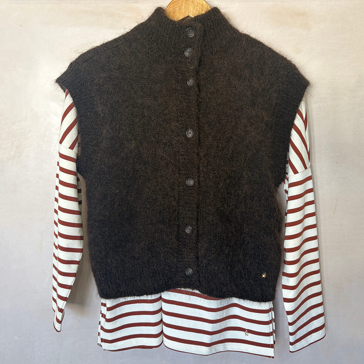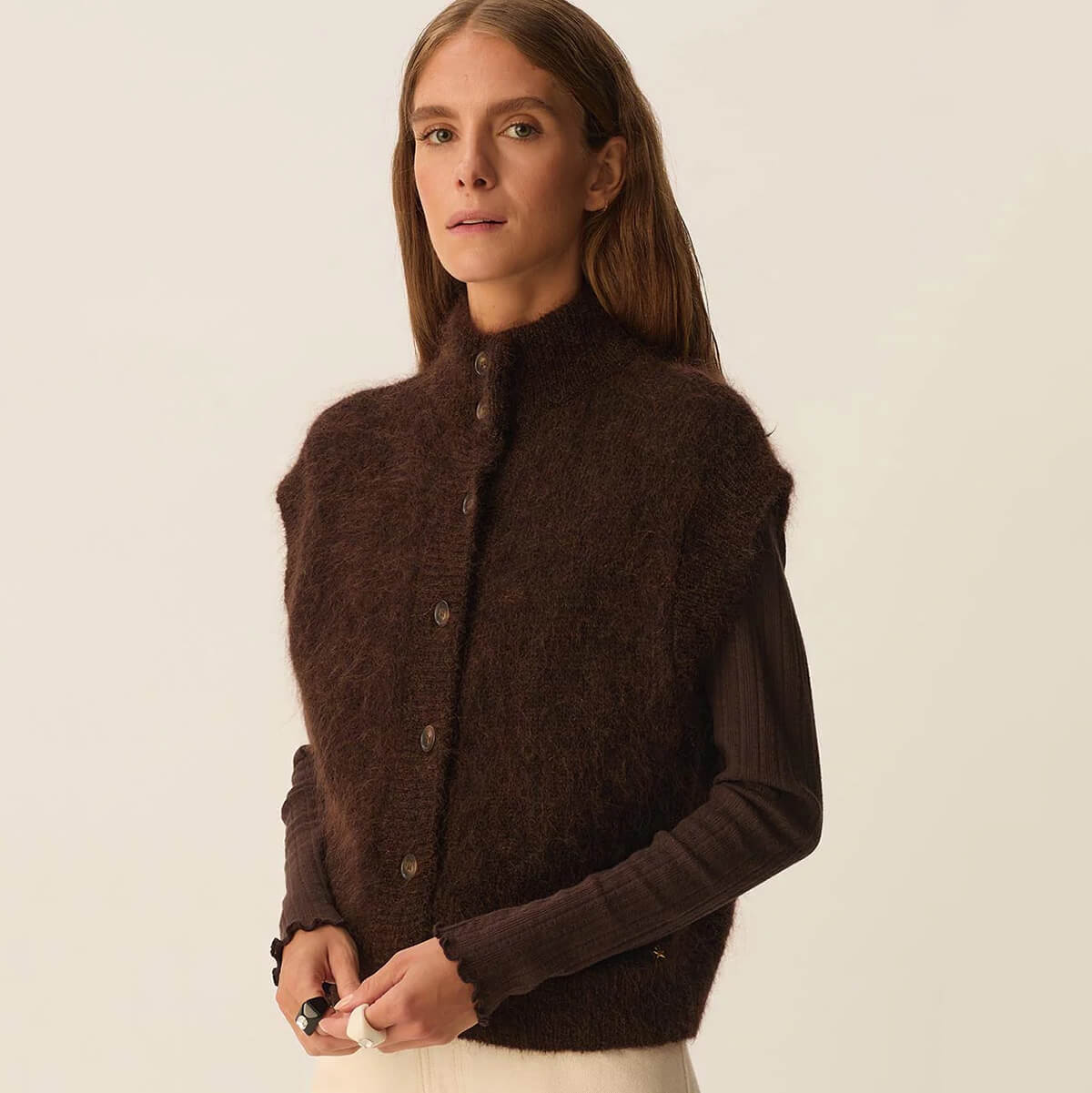 Alibou Cardigan by Des Petits Hauts. A must-have piece in your wardrobe, the Alibou sleeveless vest will be a staple in every look this season. Chic, graphic, and versatile, this warm, fluffy knit is perfect for layering over your favourite tops.