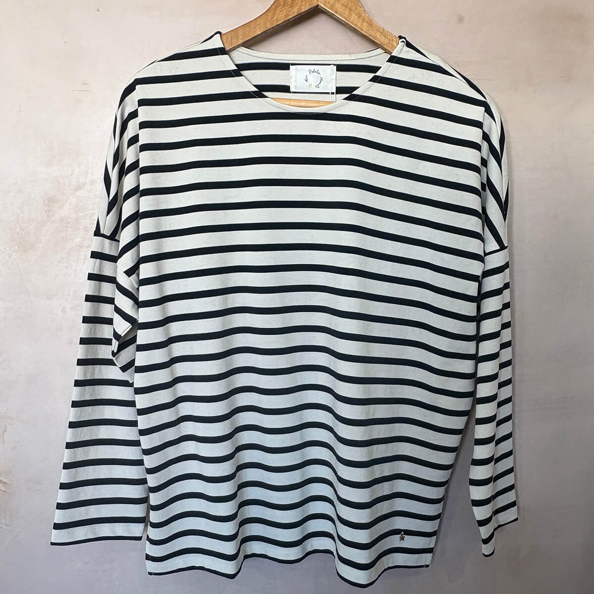 Filly Tee by Des Petits Hauts. An essential piece at Des Petits Hauts, this striped Breton top isattractive season after season. A classic, iconic long sleeve t-shirt accessorised with a gorgeous removeable brooch that varies depending on the colour.